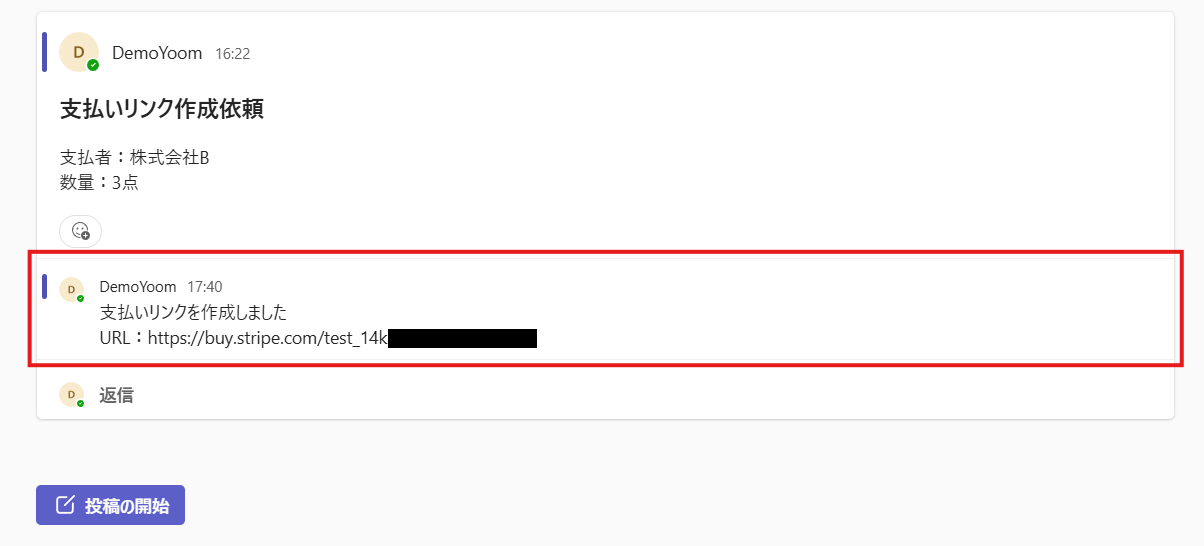 テストに成功したら、Microsoft Teamsでトリガーとなったメッセージに支払いリンクが変身されていることを確認してください。
