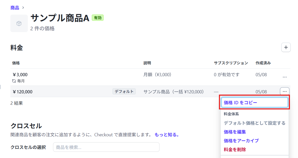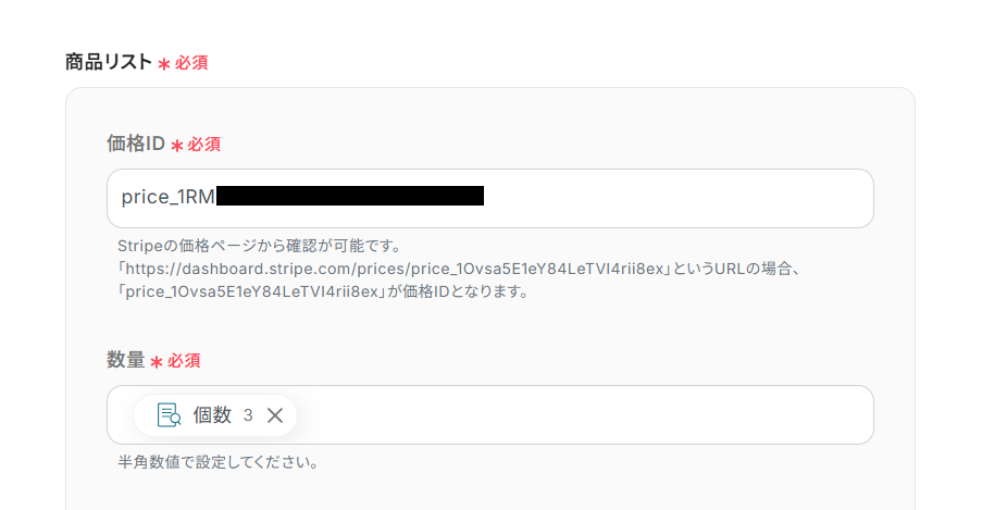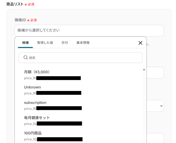 商品リストの「価格ID」に支払いリンクを作成する商品の価格IDを設定。 入力欄をクリックすると、連携しているStripeから候補が表示されますので、対象となる価格IDを選択してください。 ※ 表示される候補はサブスクリプションの価格のみです。 ※ 価格の説明が項目名になっているため、説明が設定されていない価格IDは「Unknown」になります。 価格IDはStripeの商品ページの料金リストからコピーすることもできます。