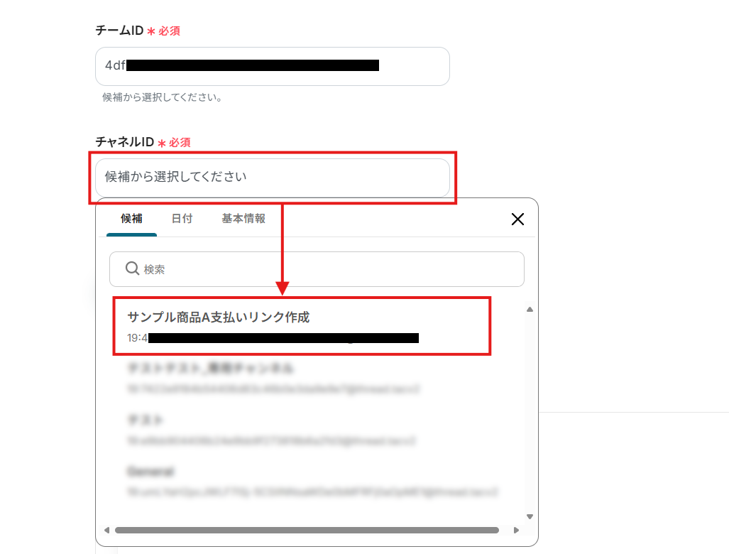 「チャネルID」にトリガーとなるチャネルのIDを設定。 選択したチーム内のチャネルが候補として表示されるため、対象となるチャネルを選択してください。