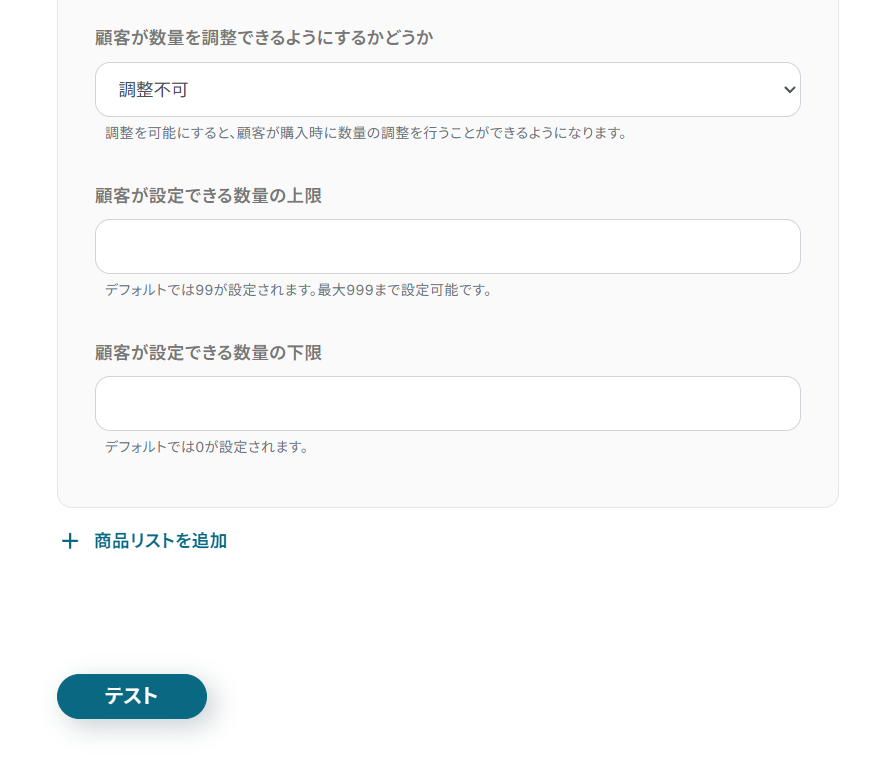 「顧客が数量を調整できるようにするかどうか」を「調整可能」「調整不可」から選択。