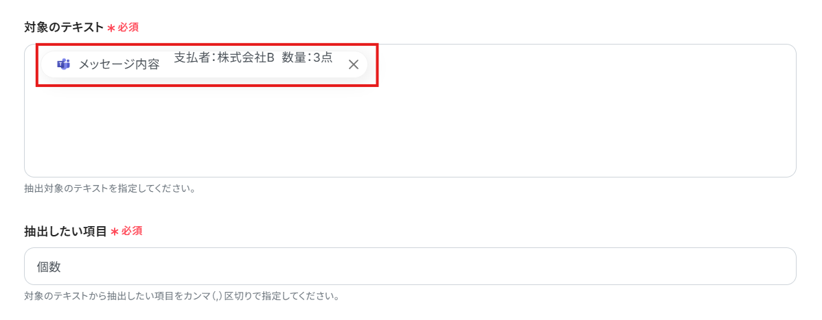 必要に応じて「指示内容」に抽出時の指示を設定。 ここでは、「個数」が半角の数値で抽出されるように設定しています。