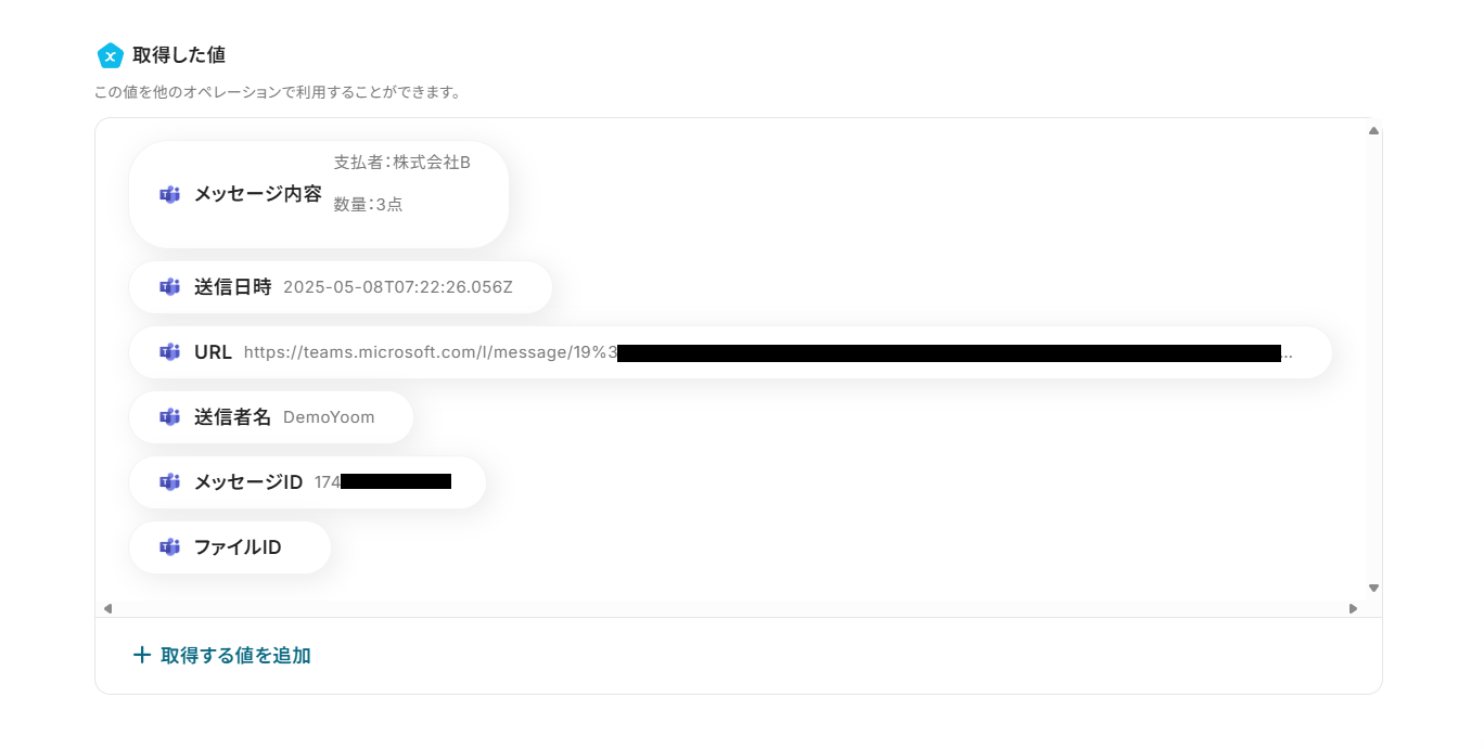テストに成功すると、「取得した値」に投稿されたメッセージの情報が追加されます。