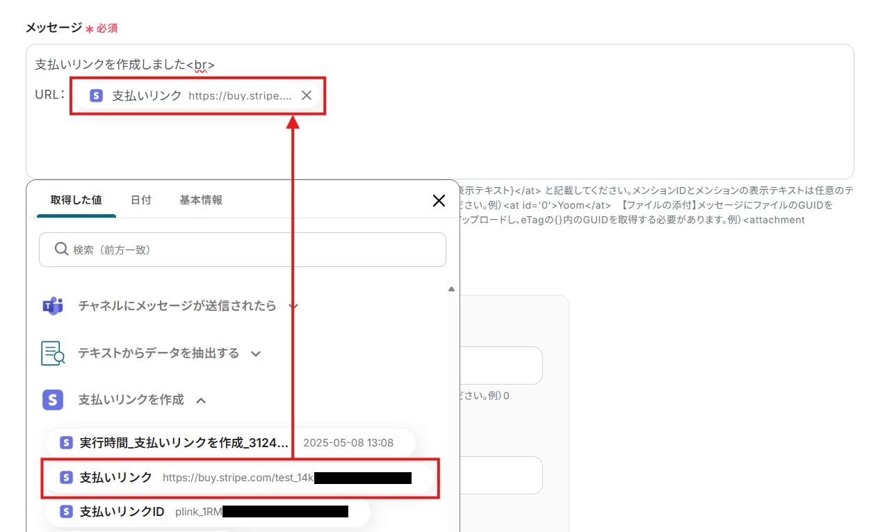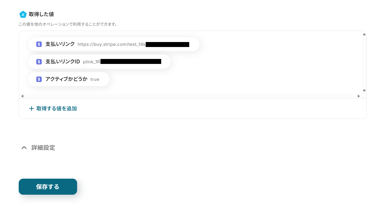 テストに成功すると、価格IDに設定した商品の支払いリンクが作成され、「取得した値」に追加されます。