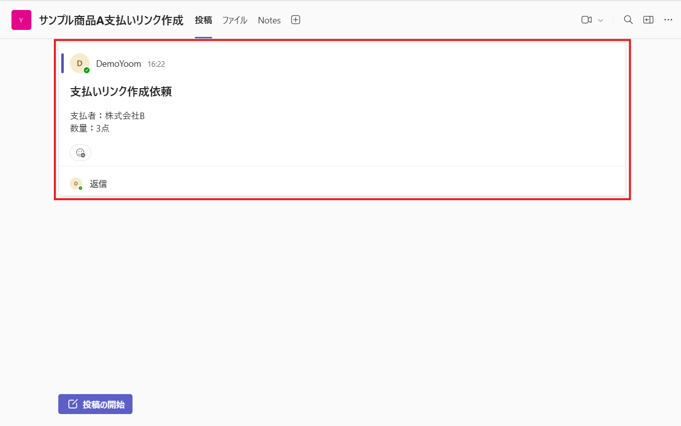 トリガーをONにしたら、実際に動作することを確認しましょう。 Microsoft Teamsの指定したチャネルにメッセージを投稿し、そのメッセージに支払いリンクが返信されていれば成功です。