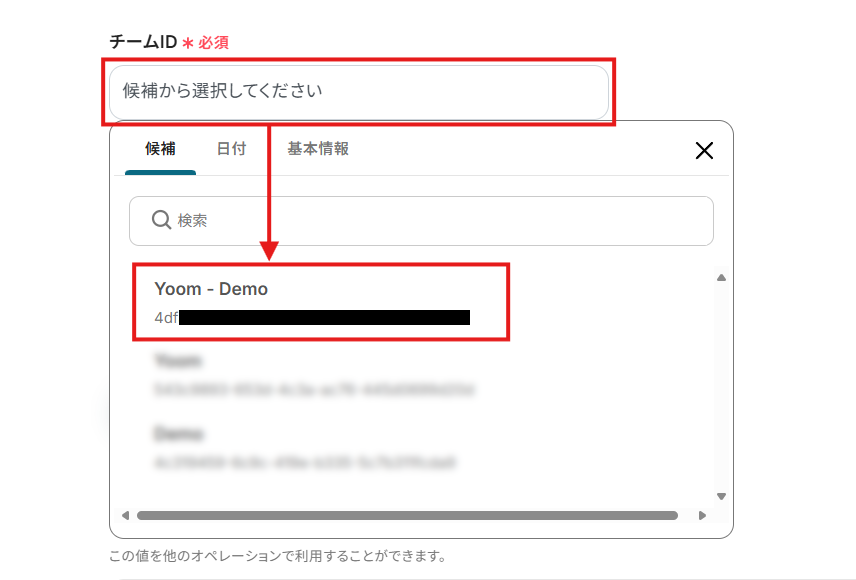 「チームID」にトリガーとなるチャネルが属しているチームのIDを設定。 入力欄をクリックすると、連携しているMicrosoft Teamsアカウントのチームから候補が表示されるため、対象となるチームを選択してください。