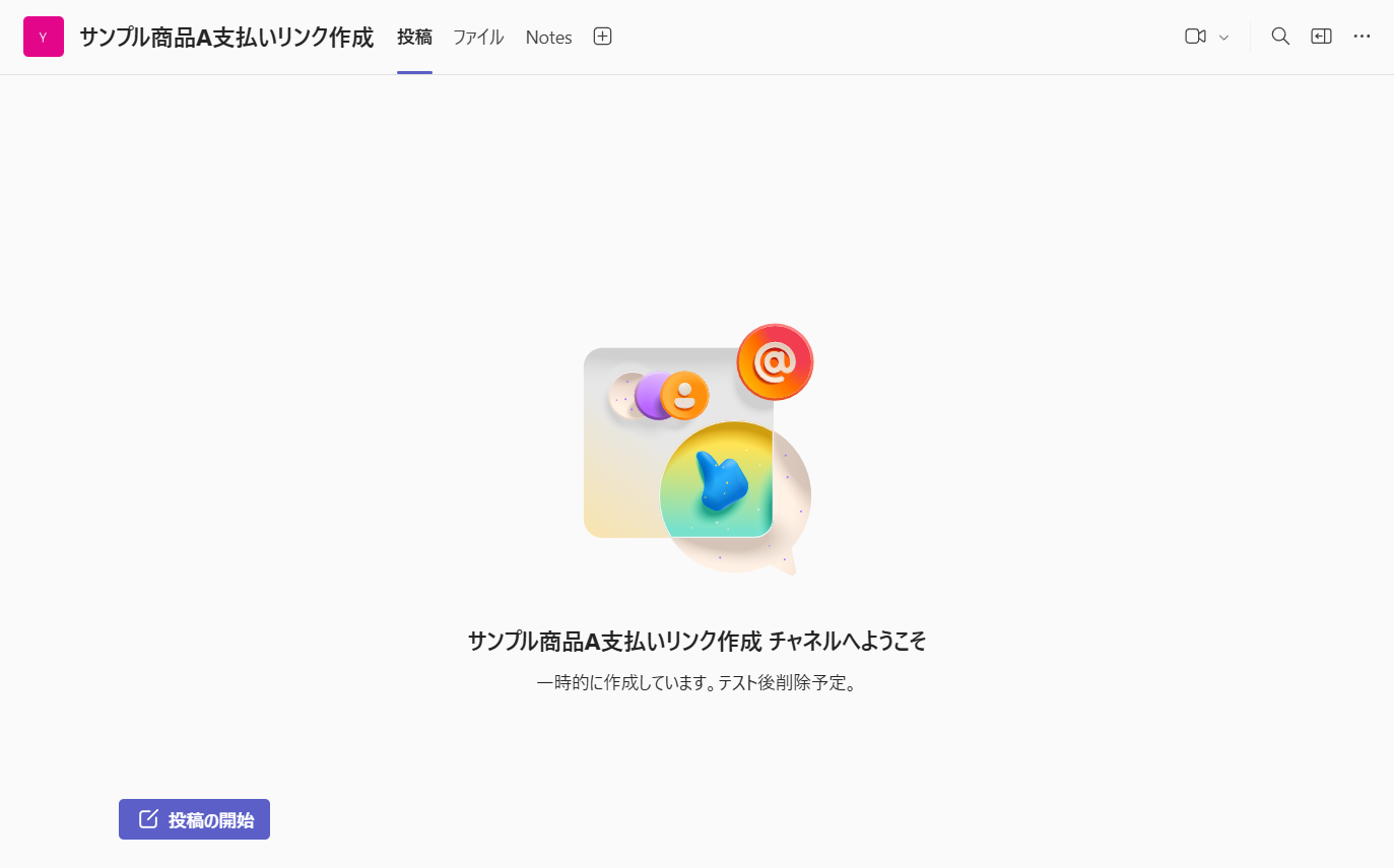 Microsoft Teamsの特定のチャネルへのメッセージ投稿をトリガーとして、Stripeに登録されている特定の商品の支払いリンクを作成し、投稿されたメッセージに対して返信する流れになります。 トリガーとして使用するチャネルと、支払いリンクを作成する商品をご用意ください。 ここでは例として、下図の「サンプル商品A支払いリンク作成」チャネルをトリガーとし、「サンプル商品A」の支払いリンクを作成していきます。