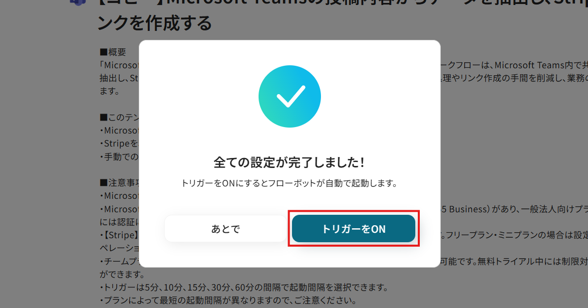 ■概要 「Microsoft Teamsの投稿内容からデータを抽出し、Stripeで支払いリンクを作成する」ワークフローは、Microsoft Teams内で共有された情報を自動的に抽出し、Stripeを使用して迅速に支払いリンクを生成します。これにより、手動でのデータ処理やリンク作成の手間を削減し、業務の効率化を図ることができます。 ■このテンプレートをおすすめする方 ・Microsoft Teamsを日常的に活用しているチームリーダーの方 ・Stripeを利用して効率的に支払い処理を行いたいビジネスオーナーの方 ・手動でのデータ抽出や支払いリンク作成に時間を取られている業務担当者の方 ■注意事項 ・Microsoft Teams、StripeのそれぞれとYoomを連携してください。 ・Microsoft365(旧Office365)には、家庭向けプランと一般法人向けプラン(Microsoft365 Business)があり、一般法人向けプランに加入していない場合には認証に失敗する可能性があります。 ・【Stripe】はチームプラン・サクセスプランでのみご利用いただけるアプリとなっております。フリープラン・ミニプランの場合は設定しているフローボットのオペレーションやデータコネクトはエラーとなりますので、ご注意ください。 ・チームプランやサクセスプランなどの有料プランは、2週間の無料トライアルを行うことが可能です。無料トライアル中には制限対象のアプリを使用することができます。 ・トリガーは5分、10分、15分、30分、60分の間隔で起動間隔を選択できます。 ・プランによって最短の起動間隔が異なりますので、ご注意ください。