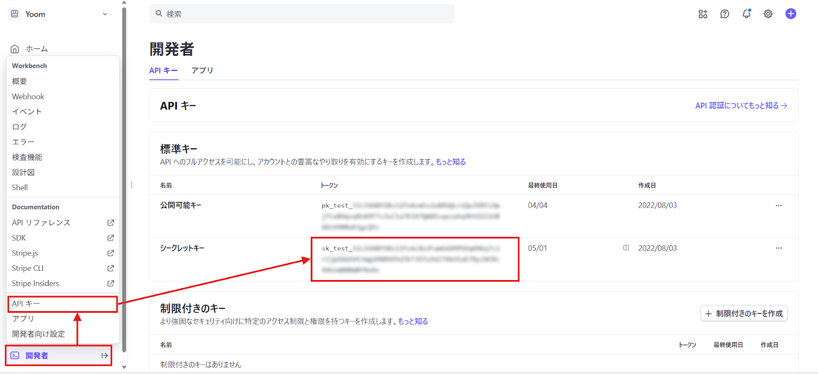 ダッシュボードの「開発者」メニューから「APIキー」にアクセスし、シークレットキーをコピー。
