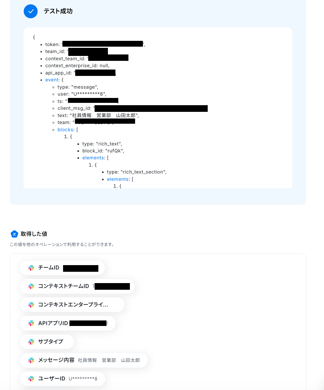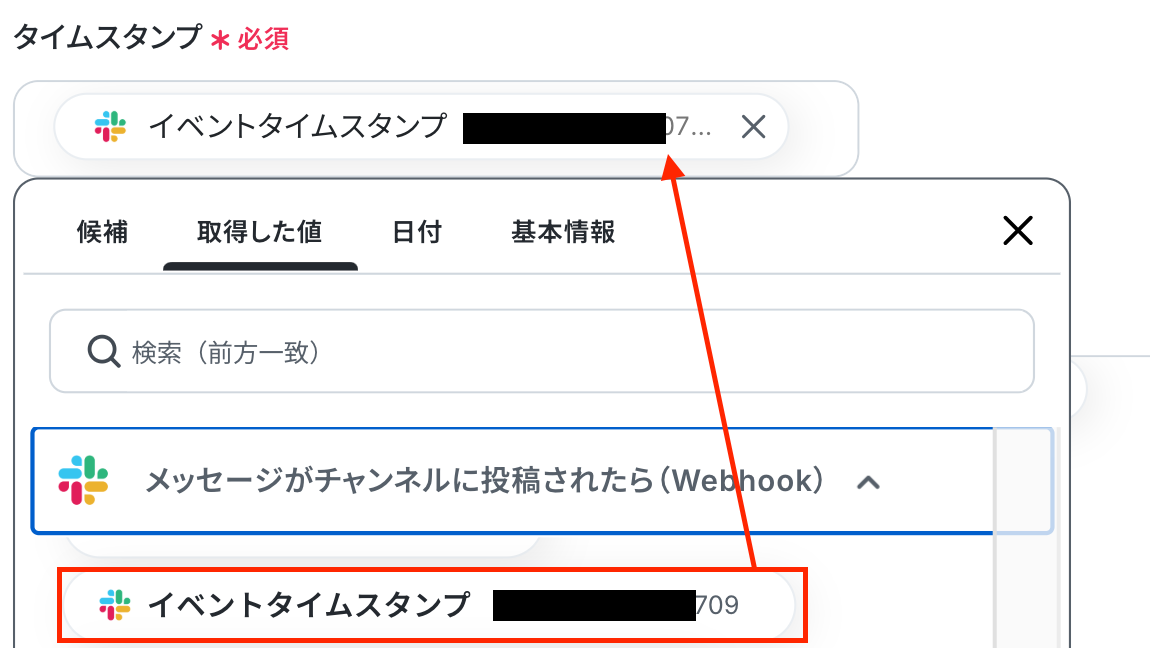 「タイムスタンプ」は、Slackのトリガー設定で取得した値から引用して設定します。
