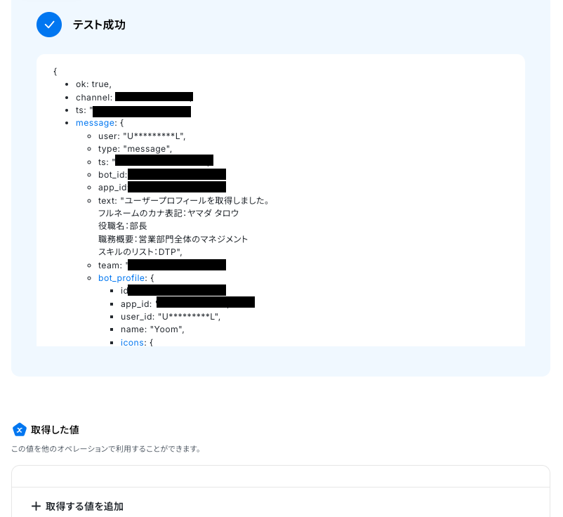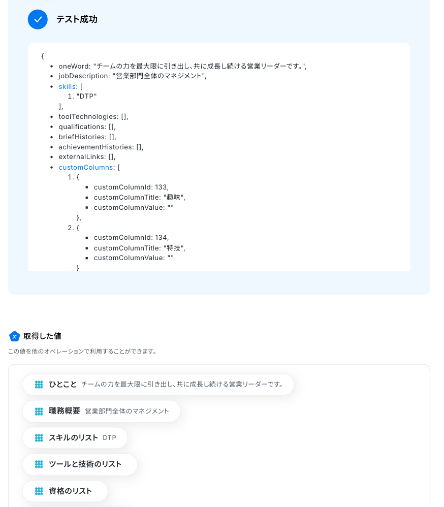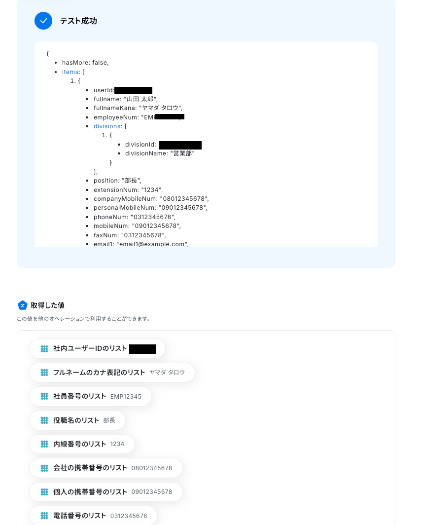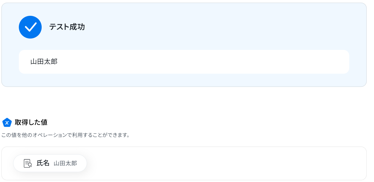 テストに成功すると、取得した値が表示されます。