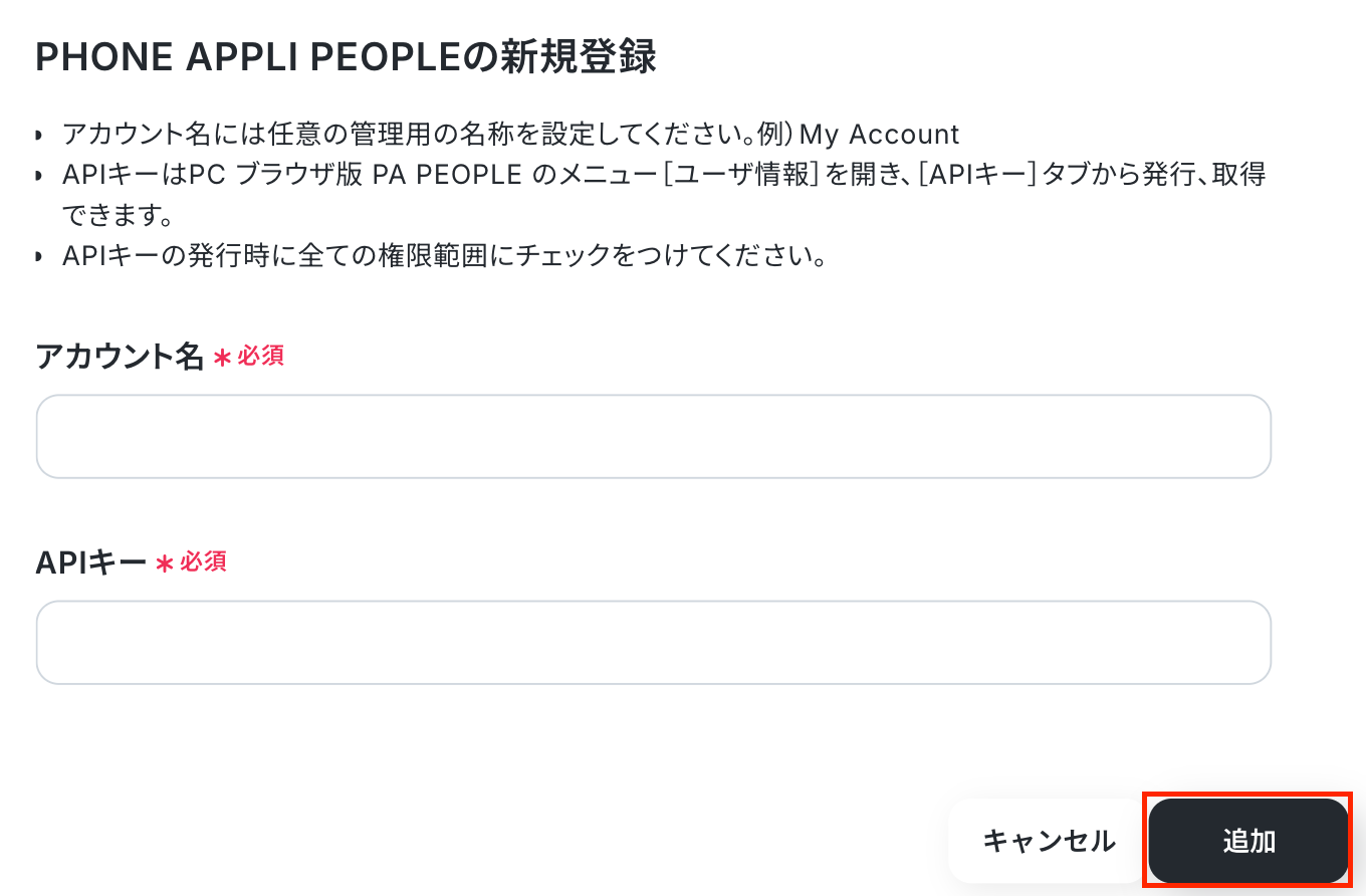 アカウント名の項目は任意のアカウント名を入力し、APIキー欄にはあらかじめコピーしたAPIキーを登録します。
