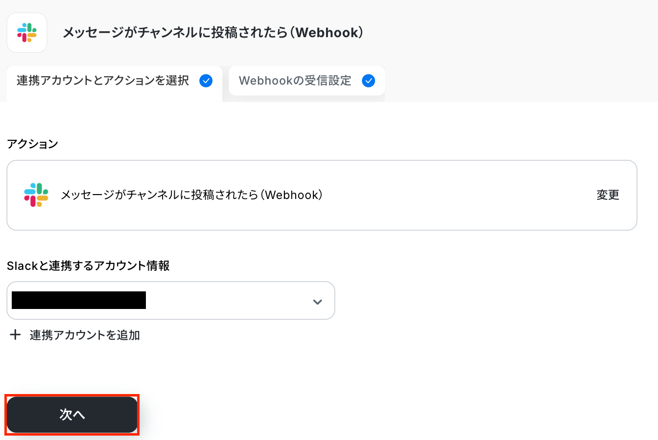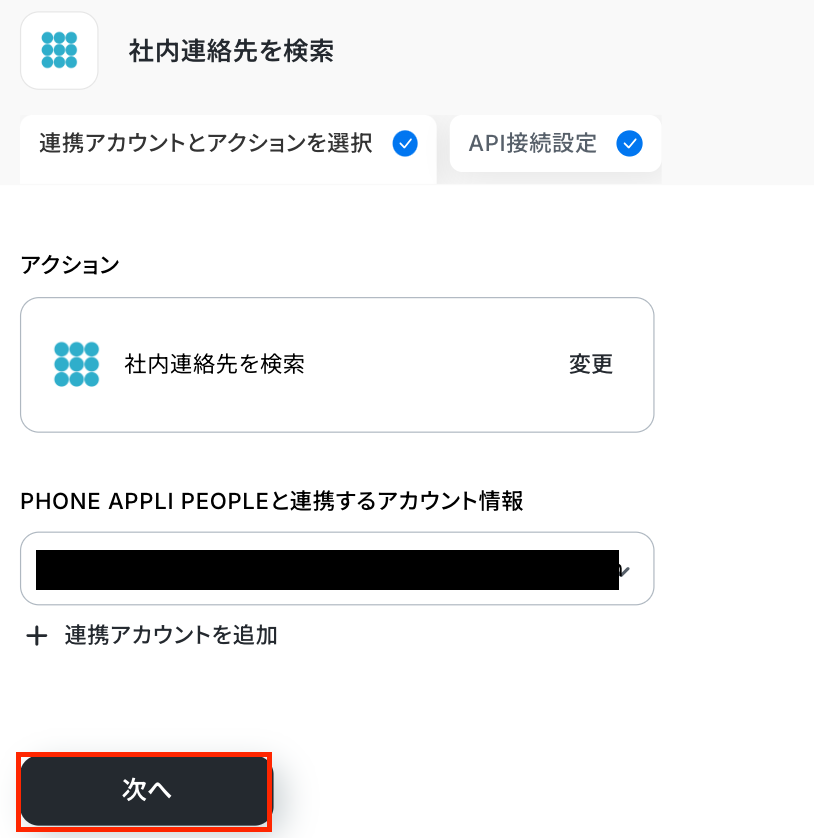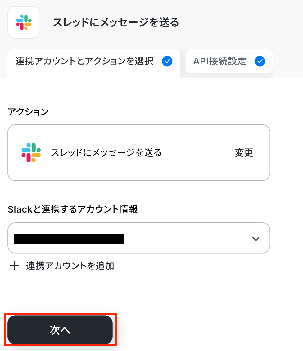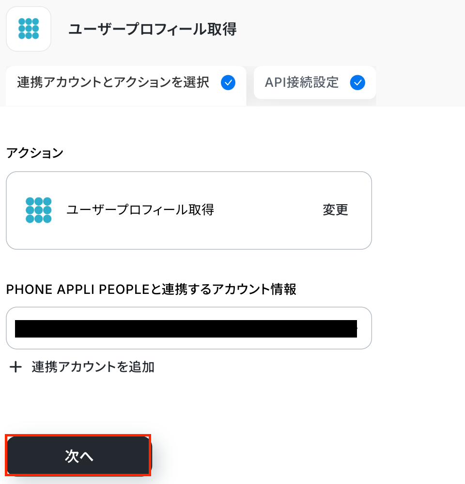 アクションはそのままで、連携するアカウント情報を確認します。