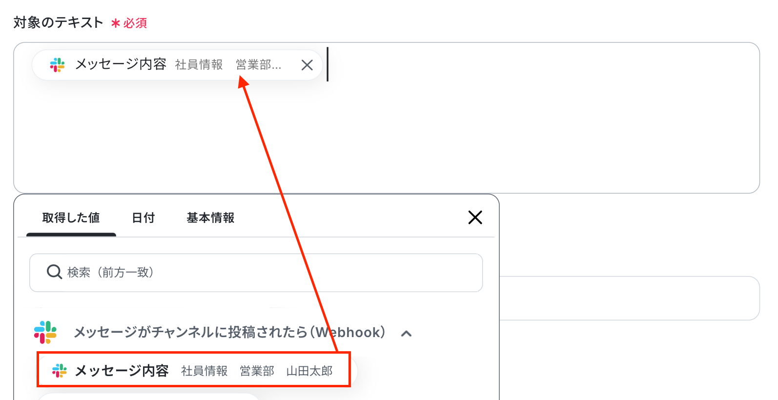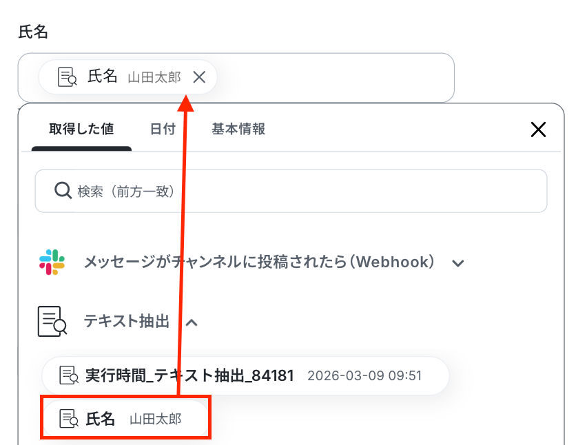 テキスト抽出設定で取得した値を引用して設定します。