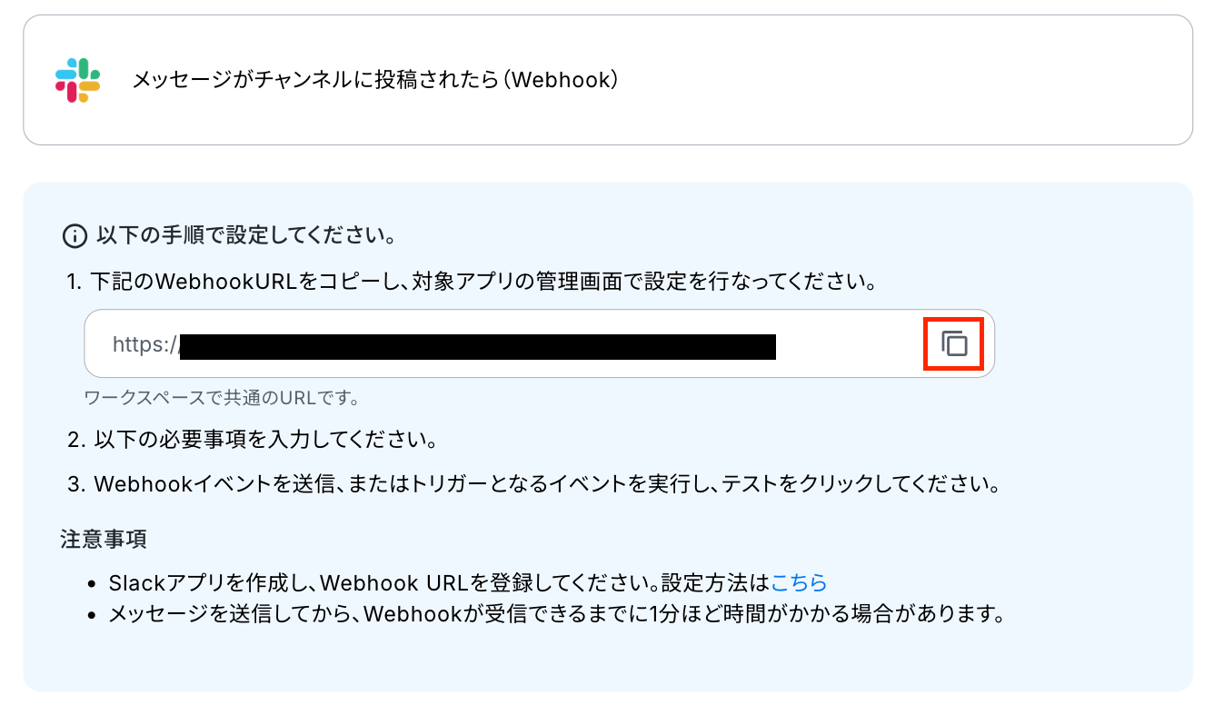 次の画面で、手順を参照し、Webhookの受信設定を行います。