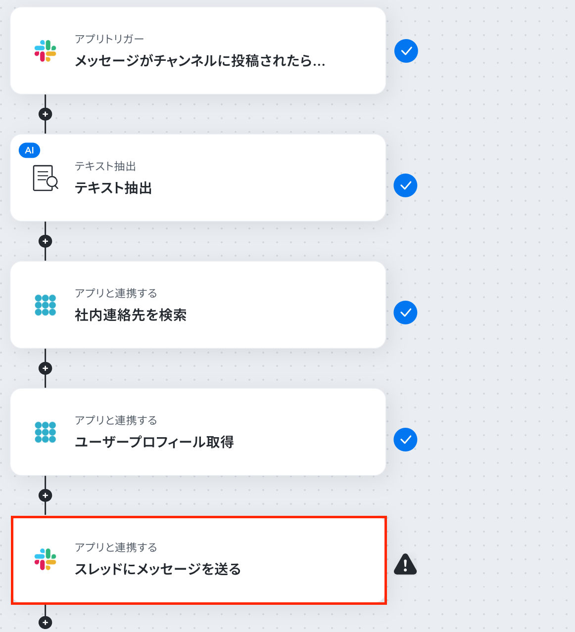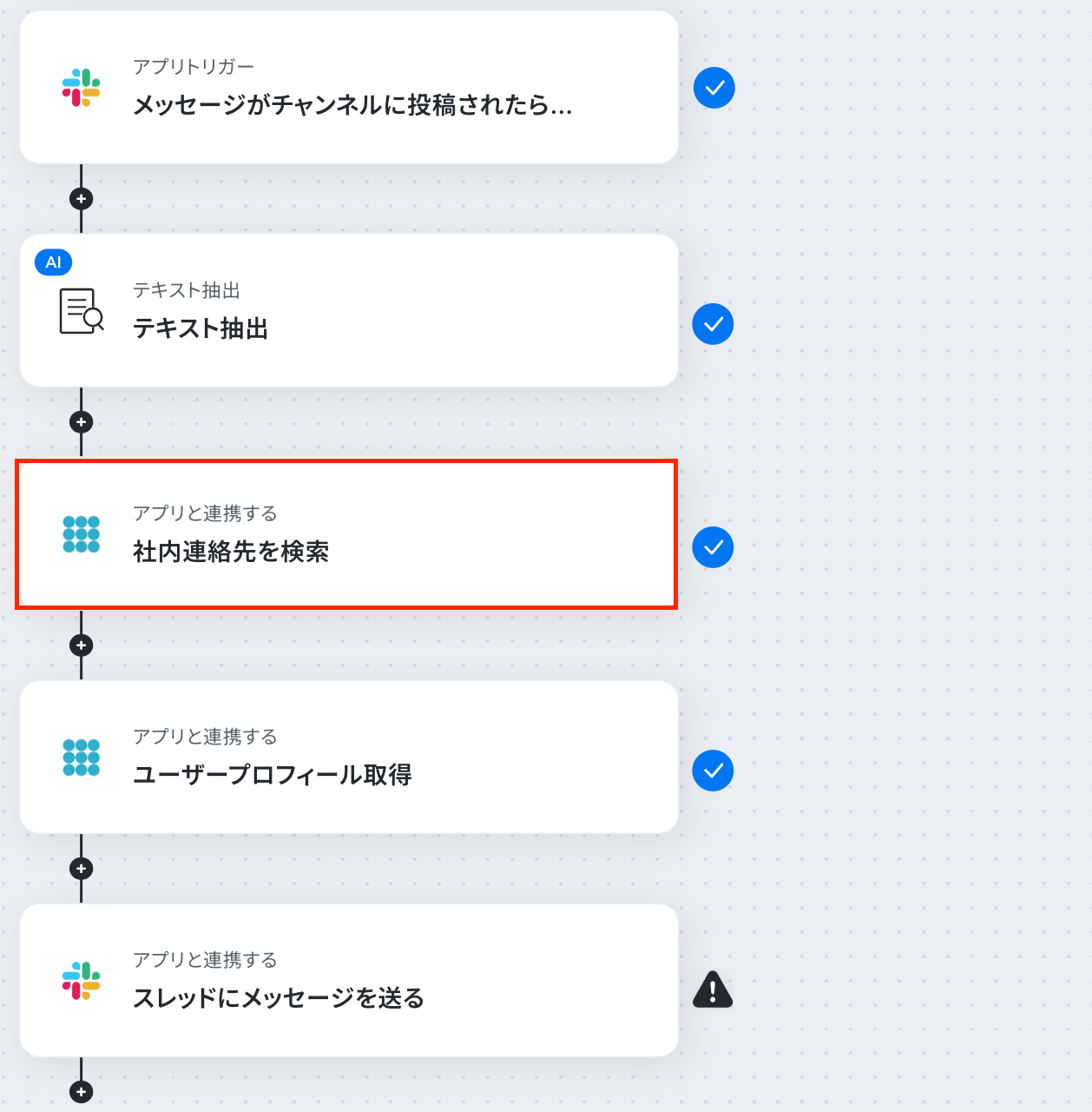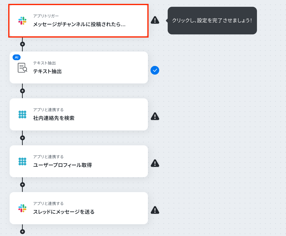 これから「Slackで特定のメッセージが送信されたら、PHONE APPLI PEOPLEでユーザープロフィールを取得しスレッドに返信する」フローを設定していきます。