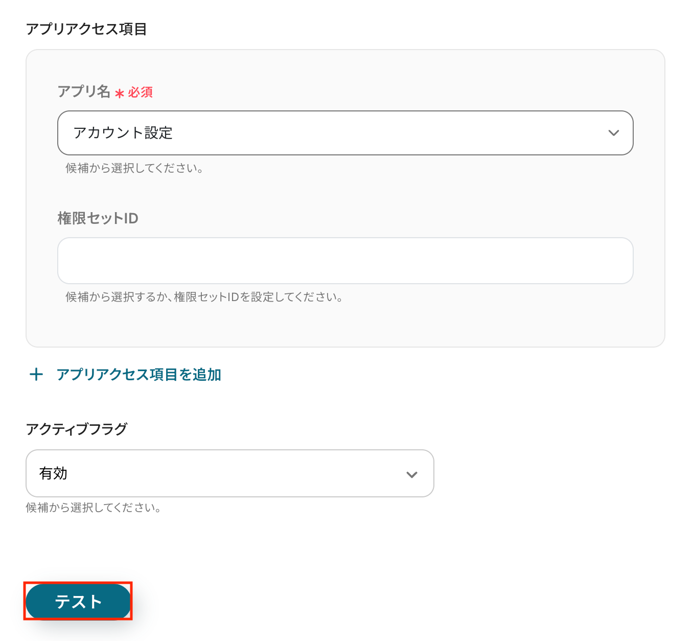 入力が完了したら「テスト」をクリックして、設定した内容でユーザーが正しく作成されるか確認しましょう。
