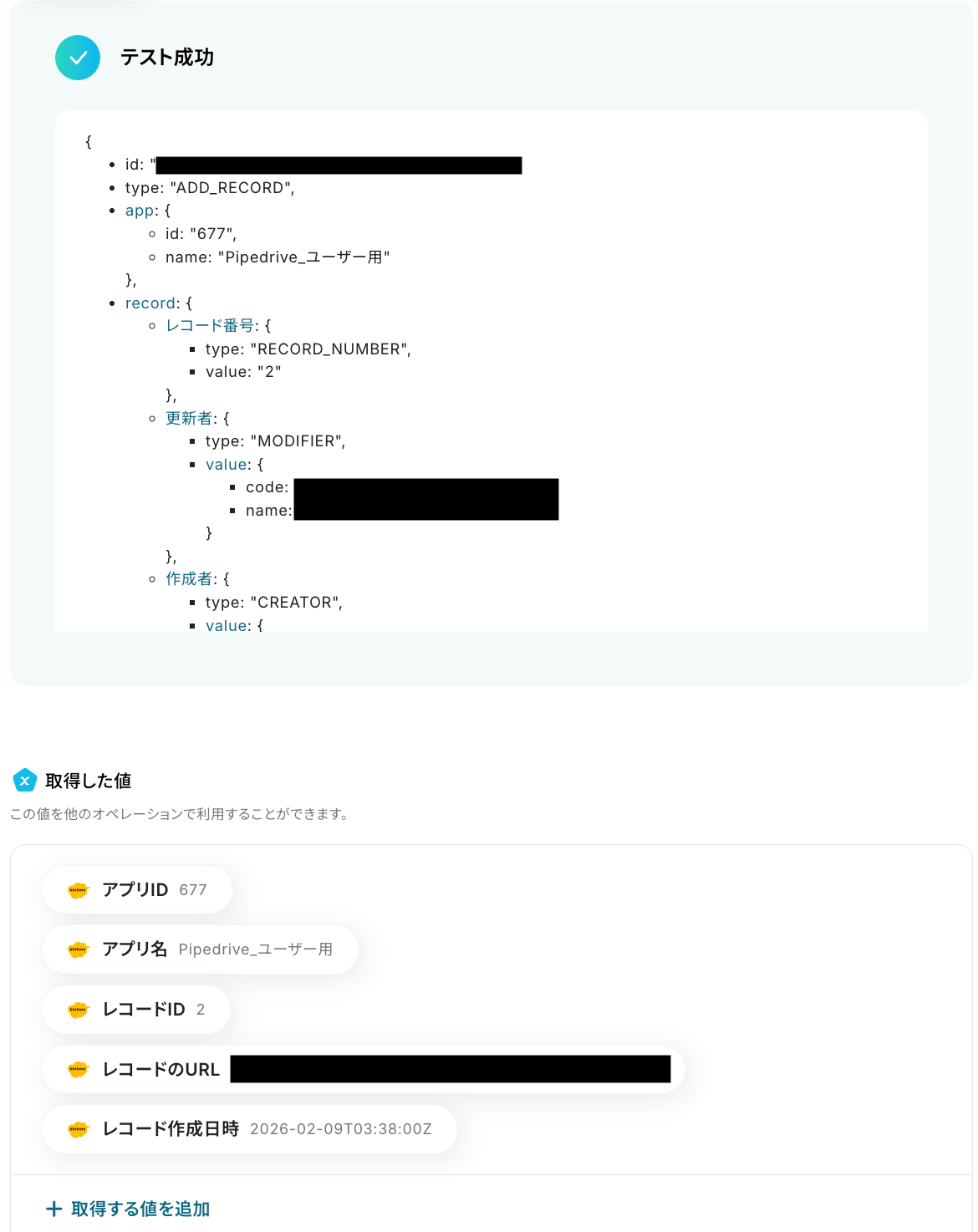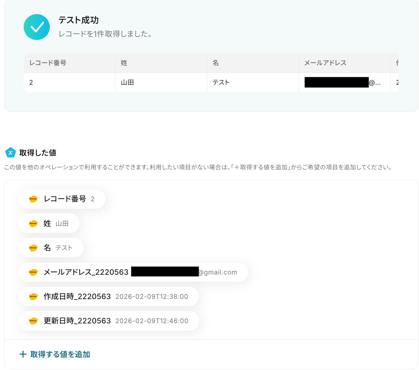 テストに成功すると、kintoneに登録されたレコード情報が表示されます。