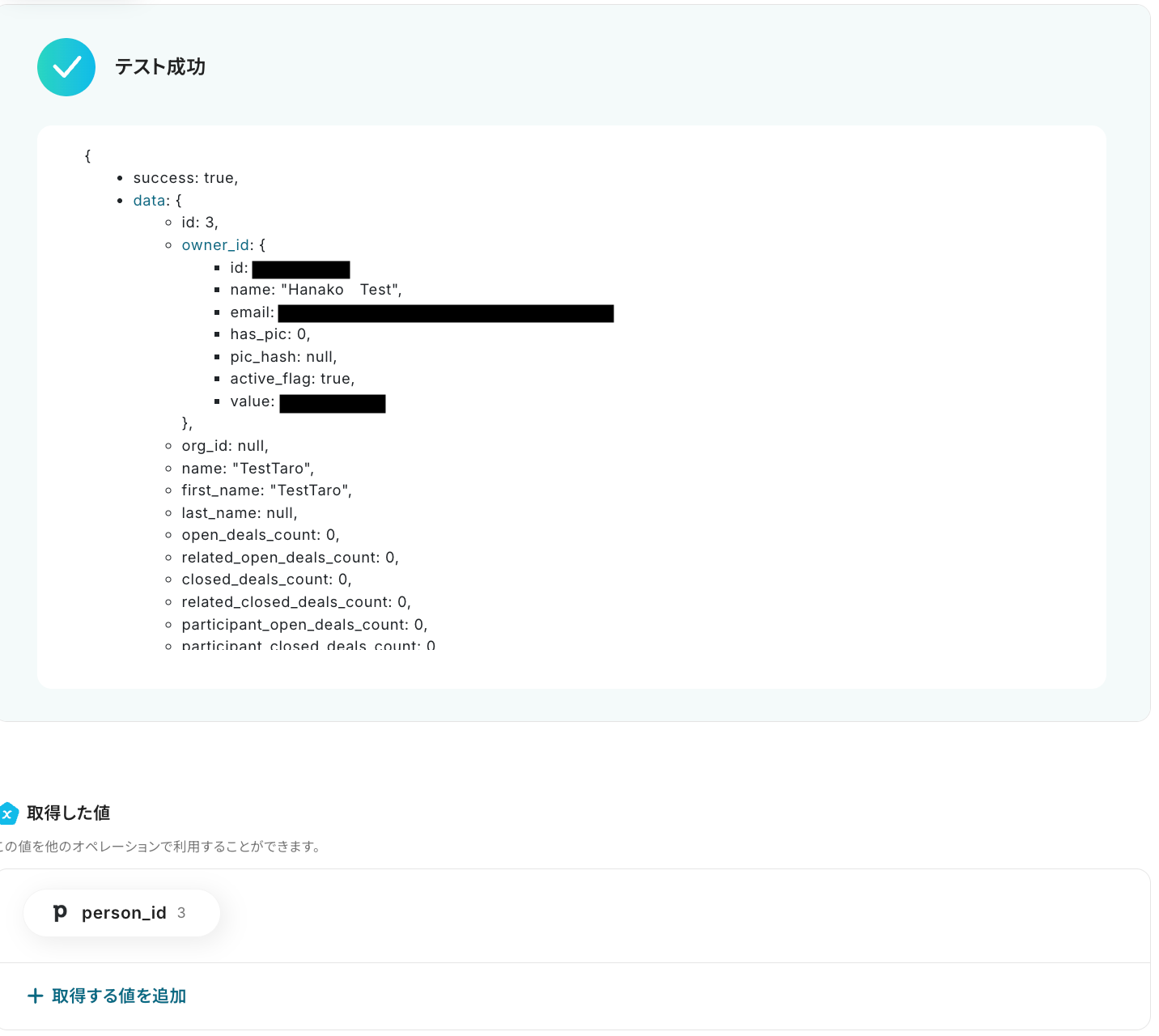 前のステップでkintoneから取得した値を利用して、Pipedriveにユーザーを作成しましょう。