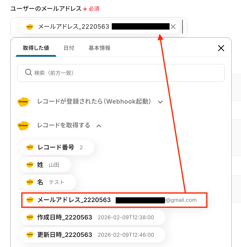 入力欄をクリックすると、前のステップでkintoneから取得した値が表示されるため、該当する値を選択して入力します。