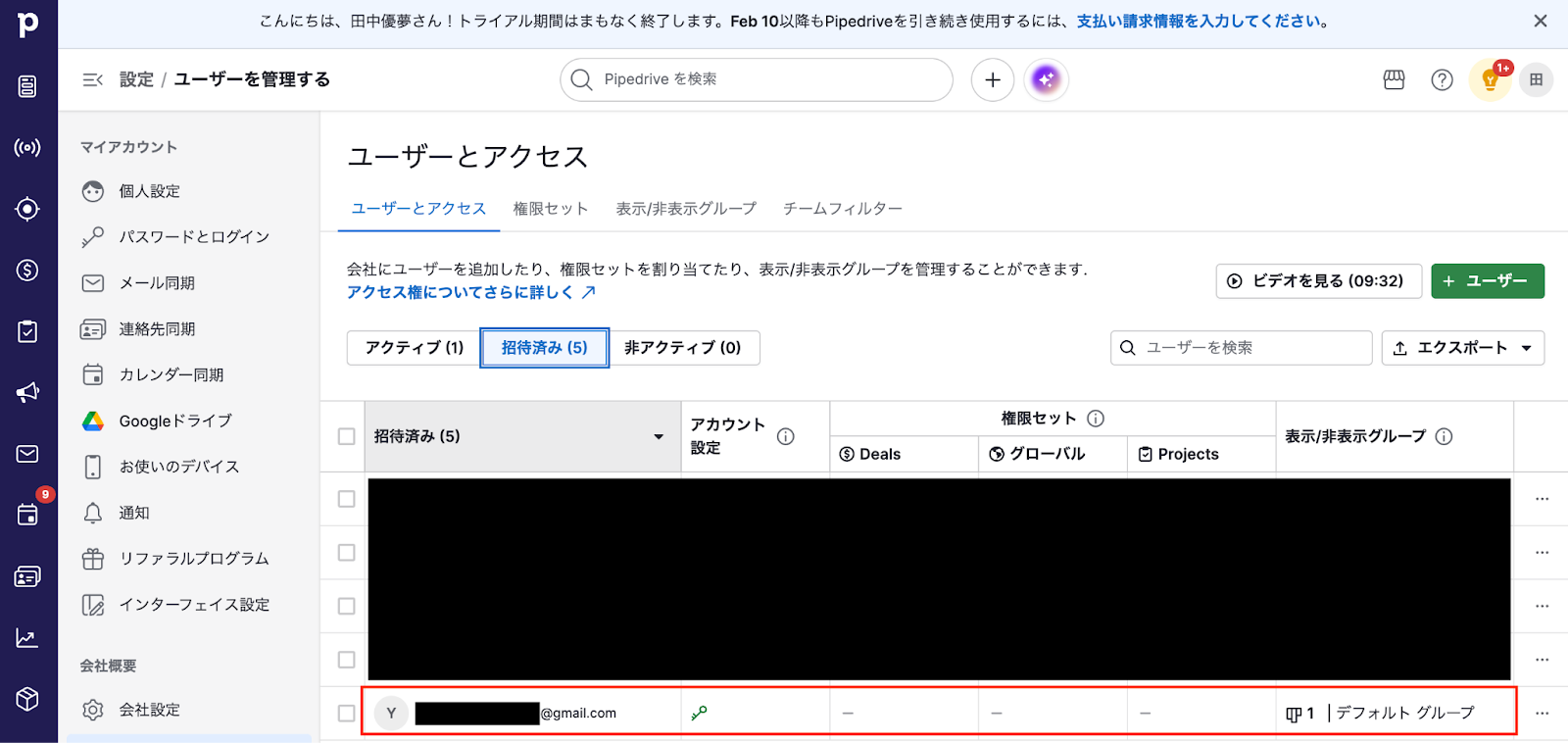 テストが成功したらPipedriveの画面を開き、ユーザーが正しく作成(招待)されているかを確認してみましょう。