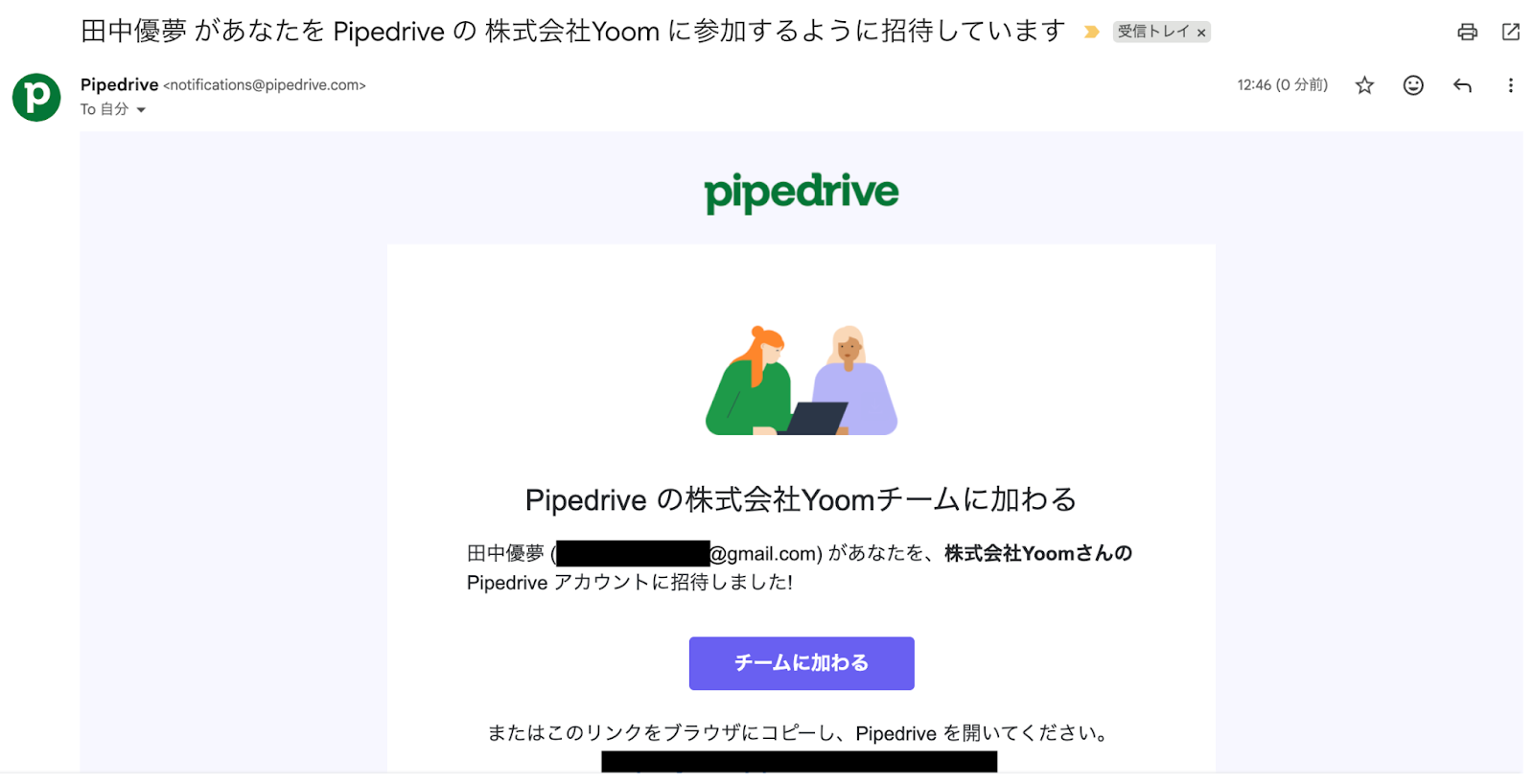 ※以下の招待メールに記載されたリンクから登録を完了すると、Pipedriveのユーザーとして有効化されます。