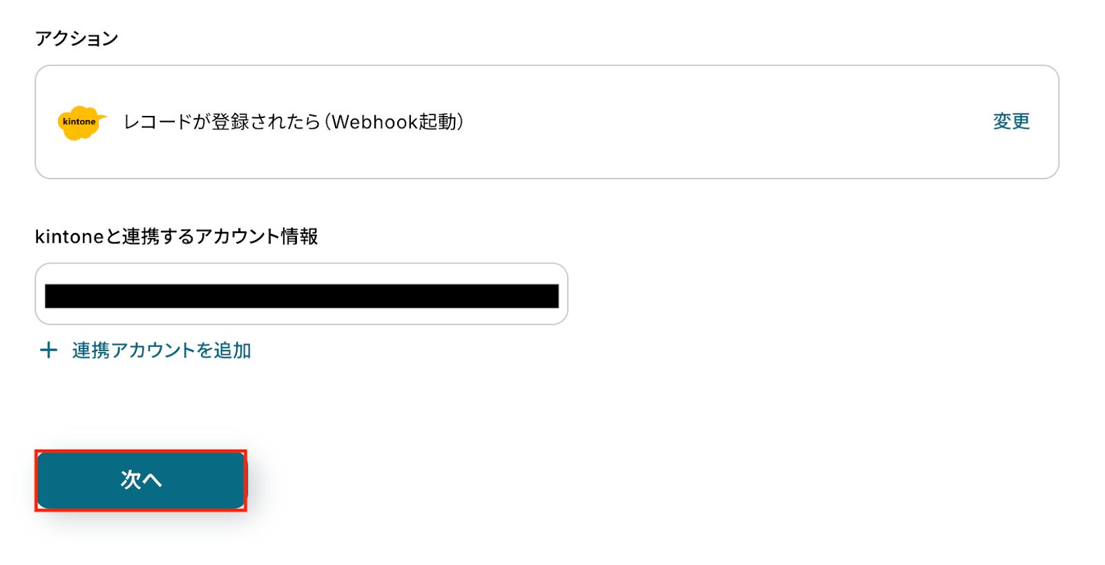 kintoneと連携するアカウント情報に問題がなければ、「次へ」をクリックします。