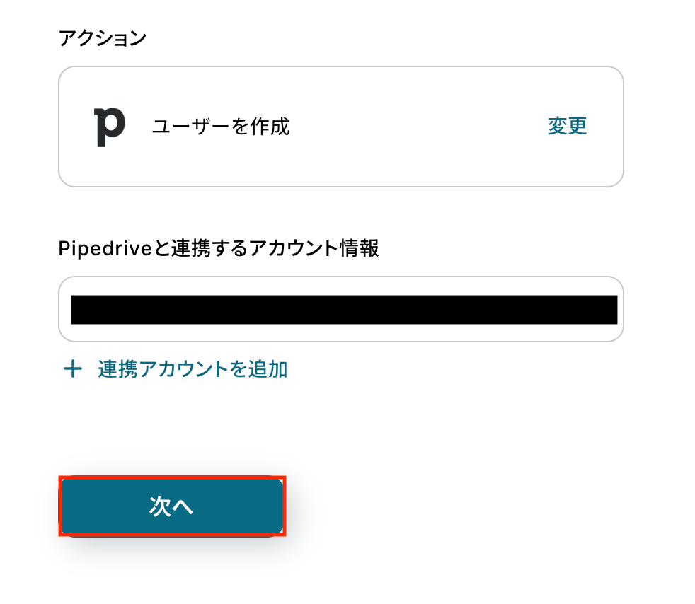 Pipedriveと連携するアカウント情報に問題がなければ、「次へ」をクリックします。