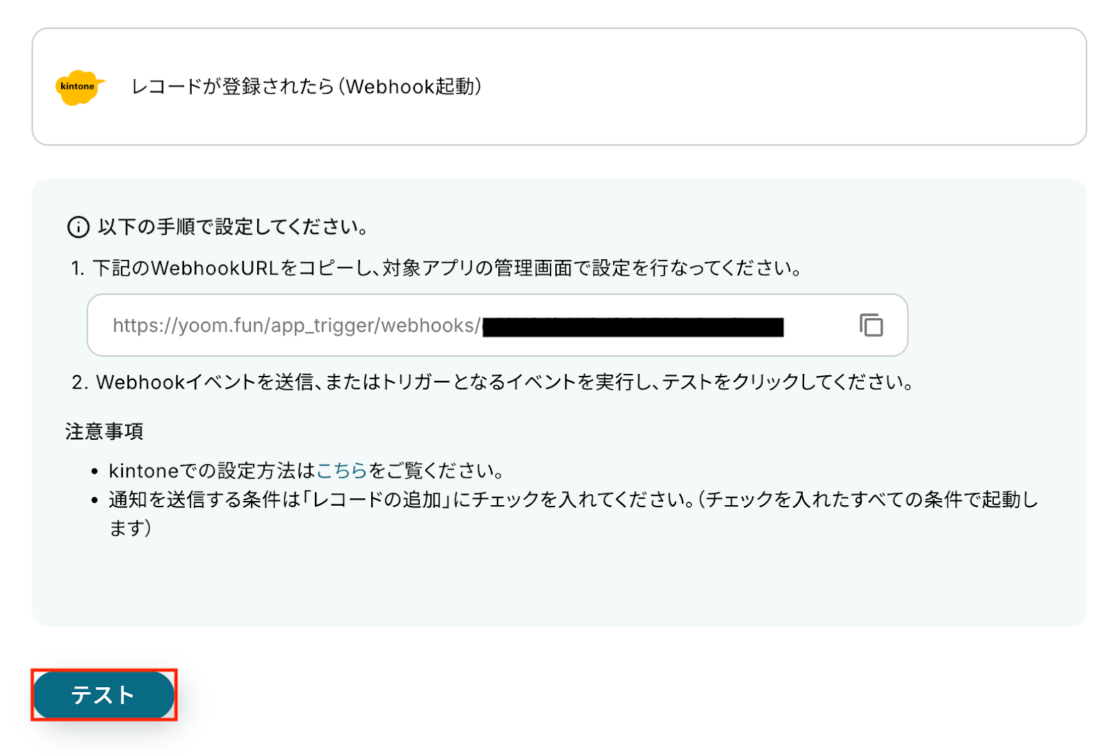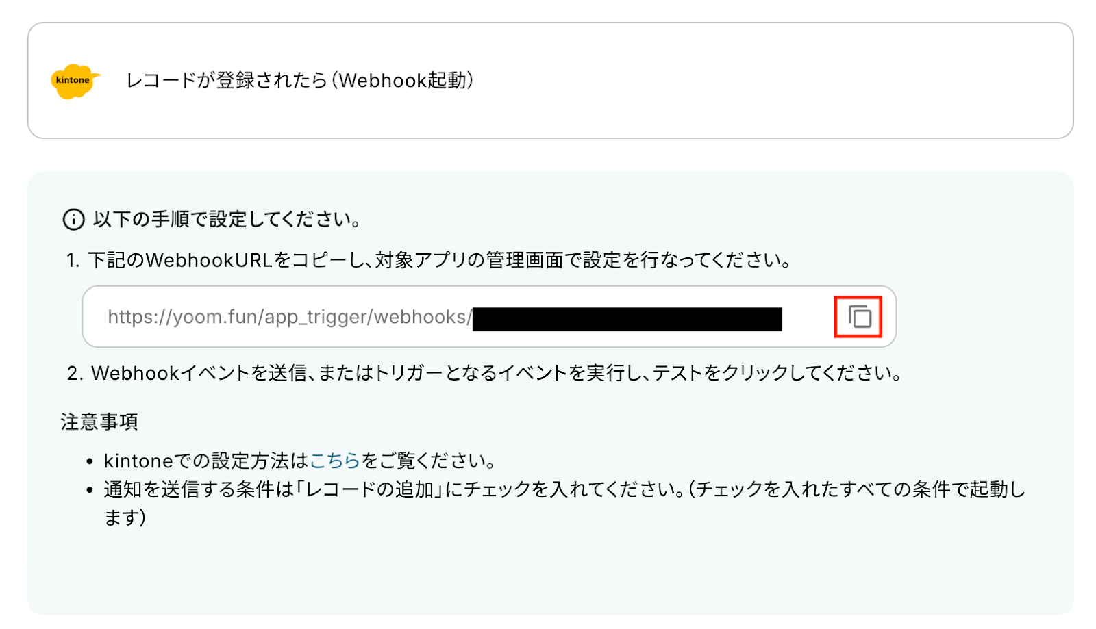 この設定により、レコードの登録といったイベントが発生した際に、その内容がWebhook経由で自動的に通知され、Yoom側で処理を開始できるようになります。