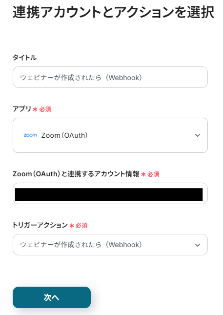 タイトルと連携するアカウント情報を任意で設定し、トリガーアクションはテンプレート通りに「ウェビナーが作成されたら(Webhook)」のまま「次へ」をクリックして進んでください。