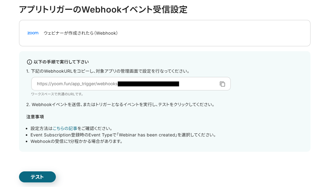 3.続いて、WebhookURLをコピーし、Zoomの管理画面で設定を行なってください。 ※詳しい設定方法はこちら をご参照ください。