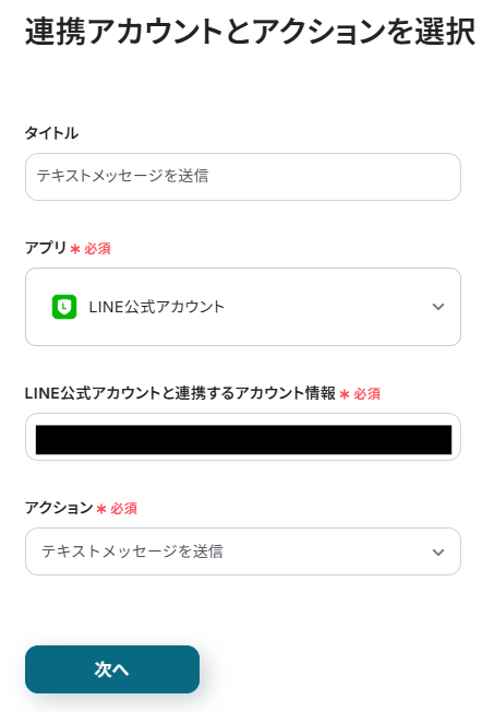 先ほどと同様にタイトルと連携するアカウント情報を任意で設定し、アクションはテンプレート通りに「テキストメッセージを送信」のまま「次へ」をクリックして進んでください。