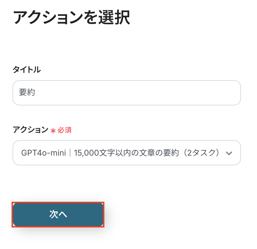 続いて、フォームから取得した回答内容をもとに、AI機能でテキストを要約する設定を行いましょう。