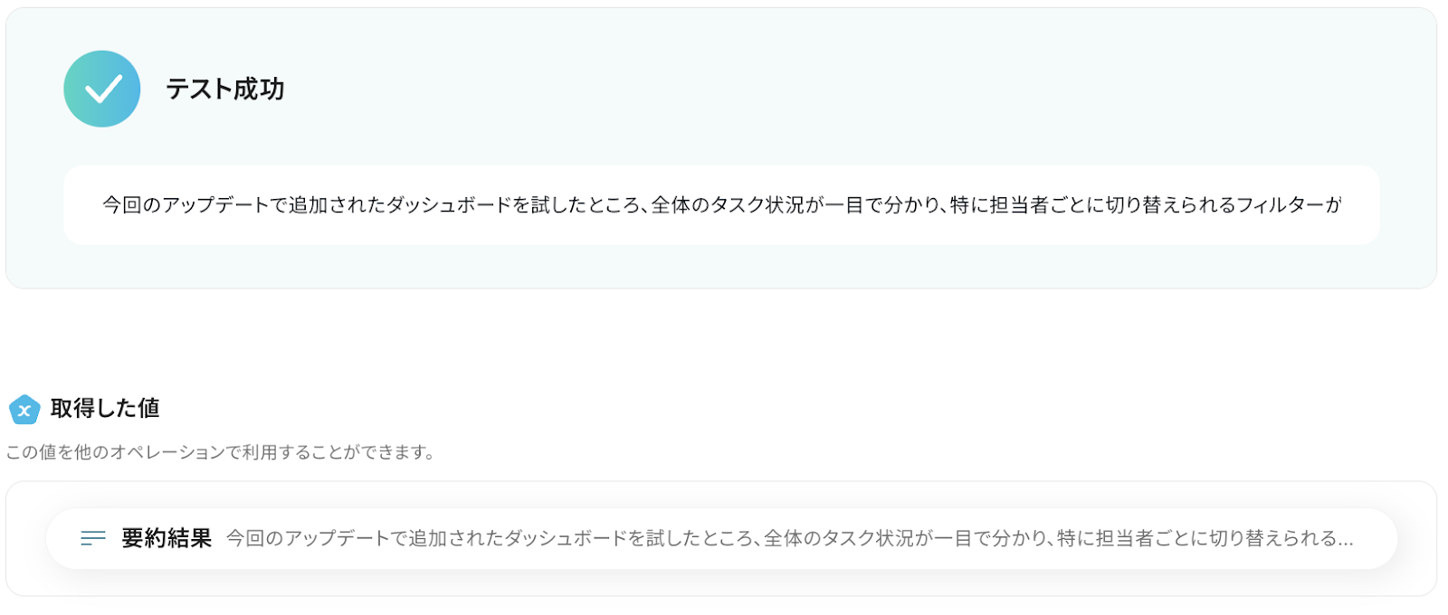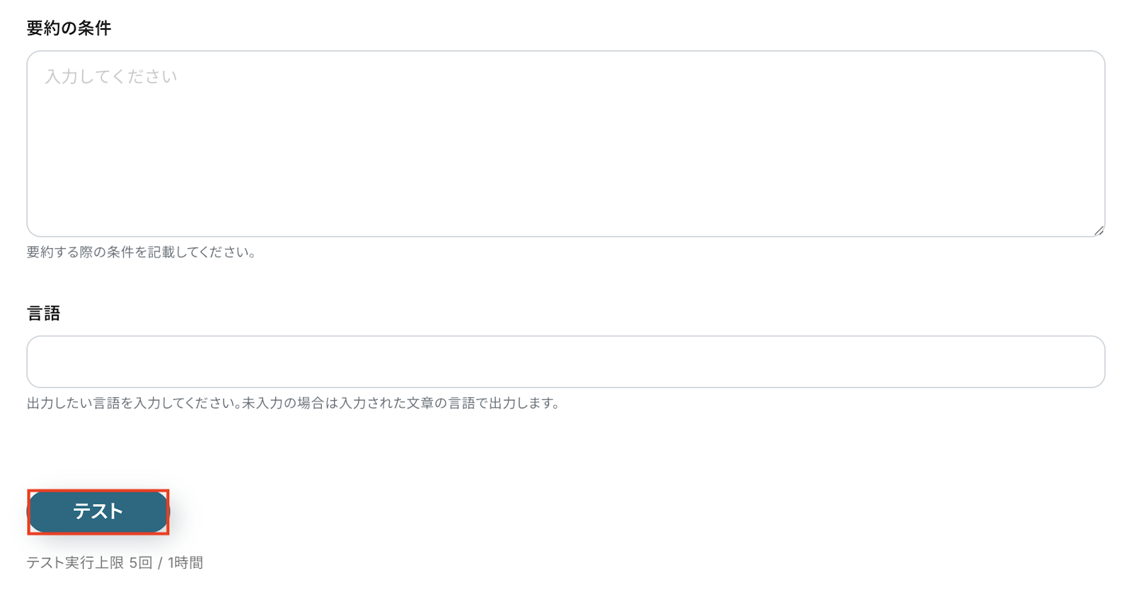 入力が完了したら「テスト」をクリックして、設定した内容でテキストが正しく要約されるか確認してください。