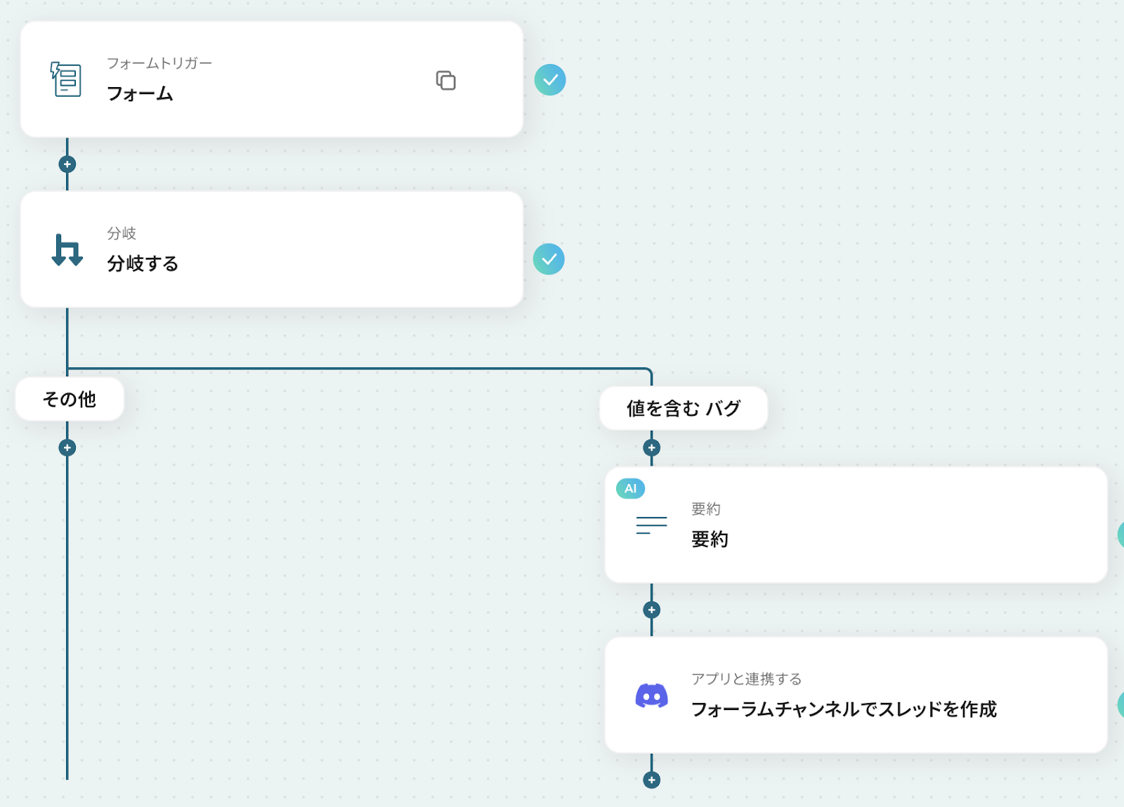 それではここから代表的な例として、フォームで受け付けたバグ報告をAIで要約し、Discordフォーラムにスレッドとして自動で作成するフローを解説していきます!