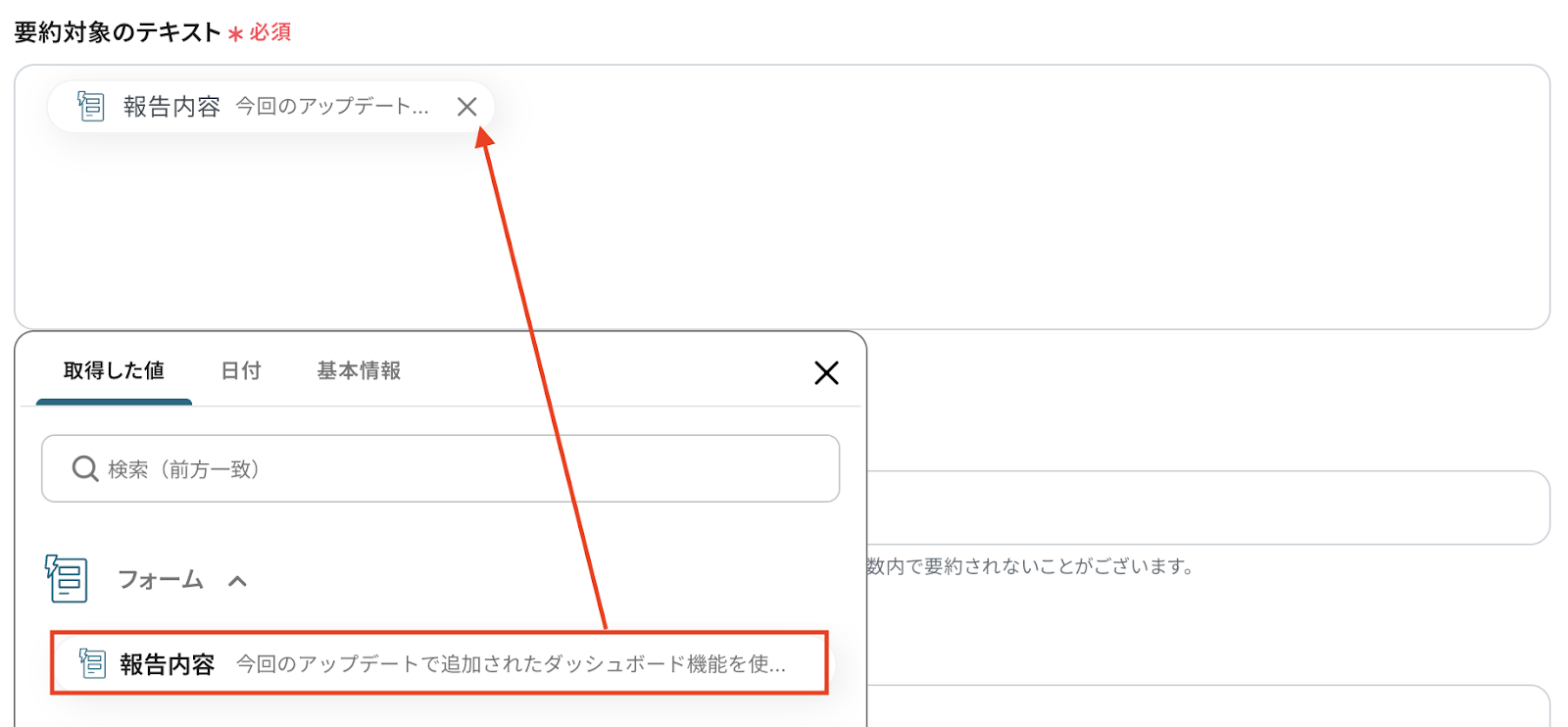 ここで入力した報告内容(=取得した値)は、この後のステップでAI機能により回答内容を要約する際に利用されます。