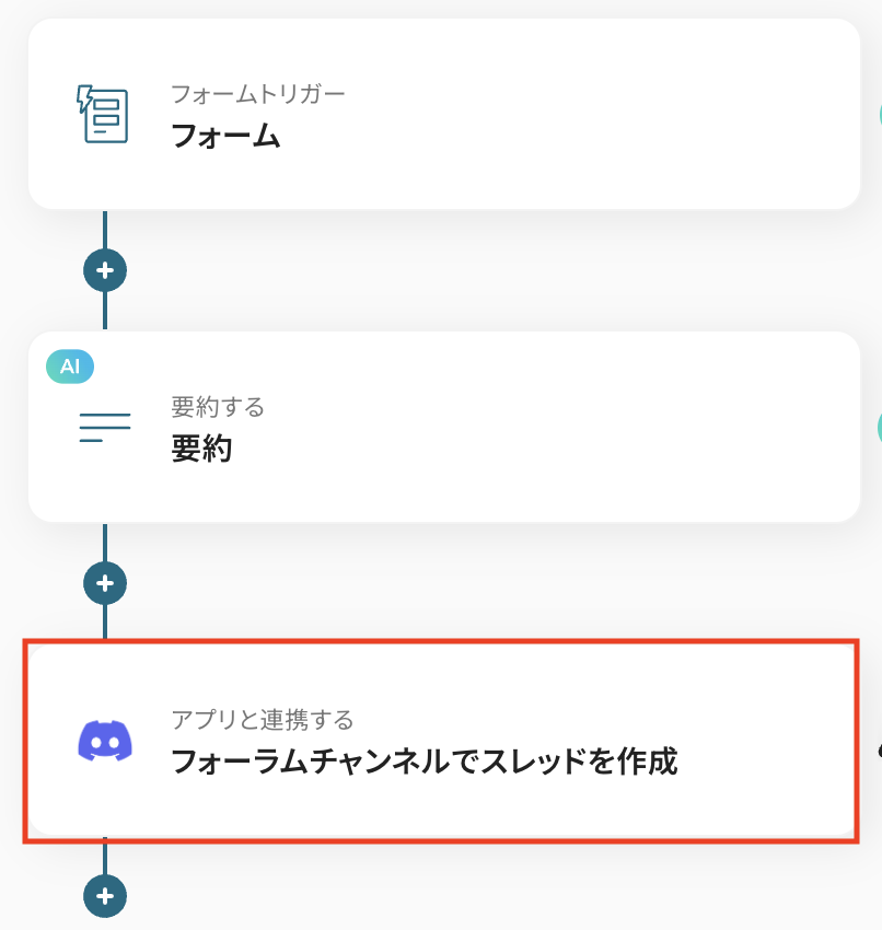 前のステップでAI機能で要約した値を利用して、Discordのフォーラムチャンネルでスレッドを作成し、メッセージを送信しましょう。
