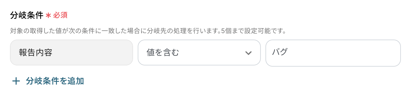 3.分岐条件を「報告内容にバグという値を含む場合」に設定します。
