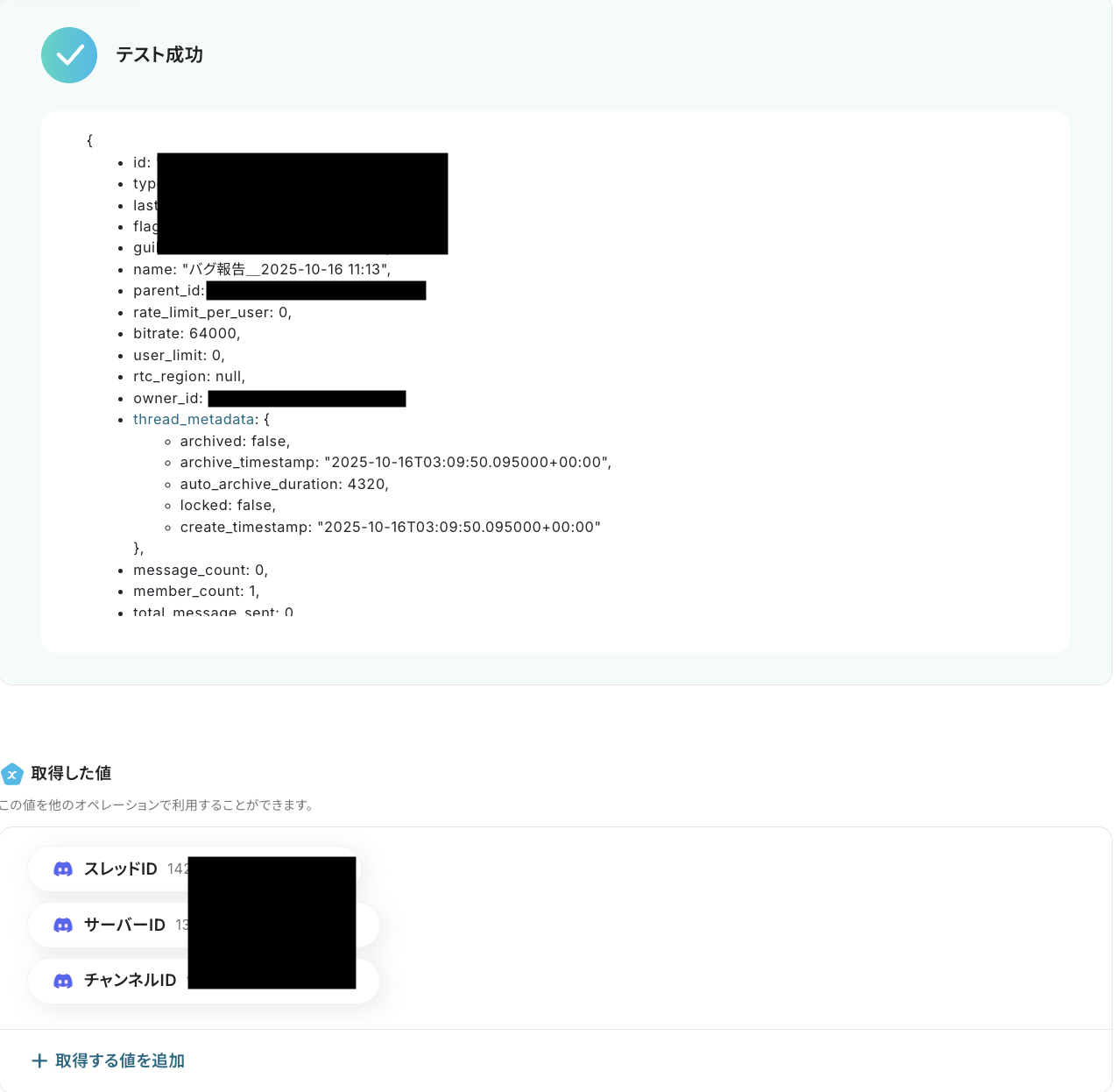 以下の画像の取得した値を利用して、Discordでスレッドの作成・メッセージの送信が可能です。