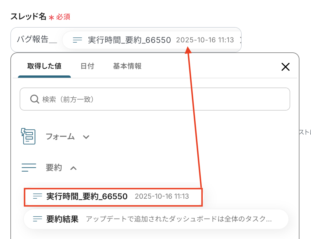 入力欄をクリックすると、前のステップでフォームから取得した値が表示されるので選択して入力しましょう。