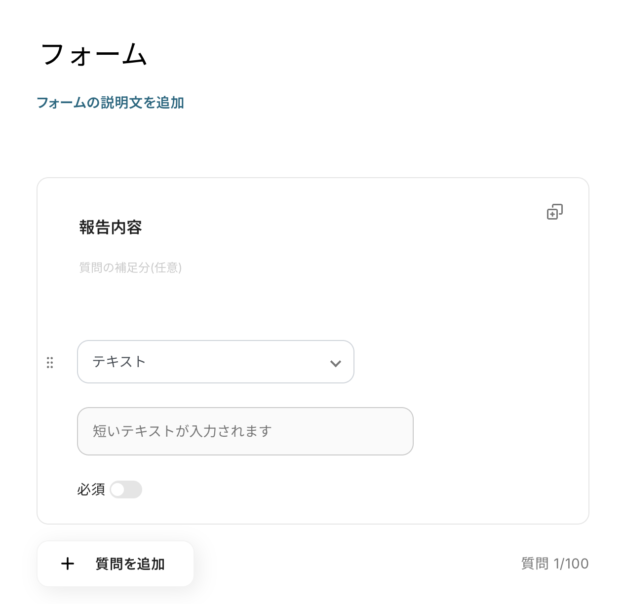 今回の例では、あらかじめ用意されているデフォルトのフォーム設定を使用し、「報告内容」欄に入力された回答内容を活用する想定で進めます。
