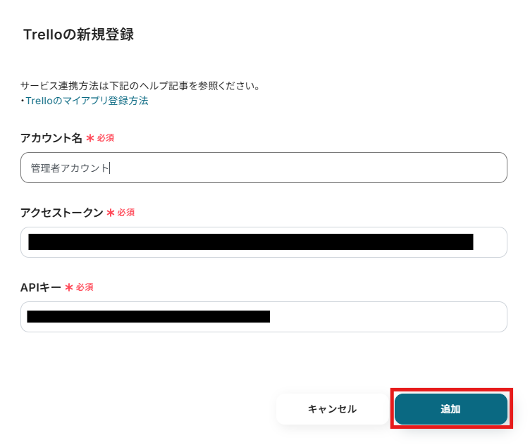 Yoomのマイアプリ登録画面に戻り、任意の「アカウント名」を入力します。「アクセストークン」と「APIキー」には、それぞれ先ほどコピーした値を貼り付けて「追加」をクリックし、Yoomとの連携完了です!