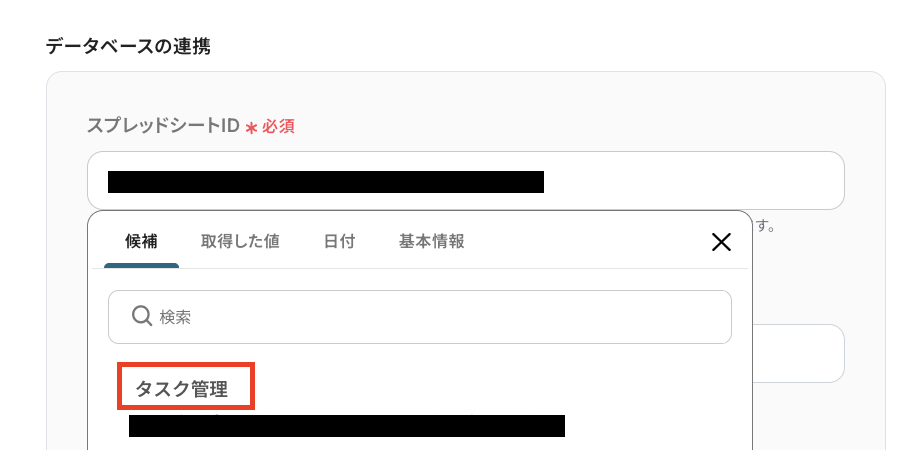「スプレッドシートID」と「スプレッドシートのタブ名」を、入力欄をクリックして表示される候補から選択してください。