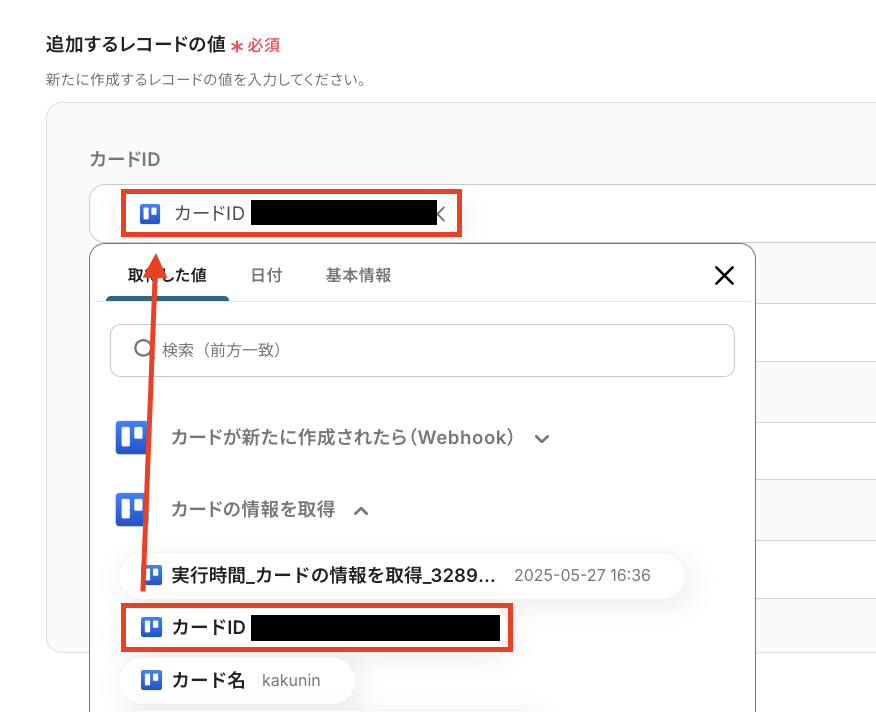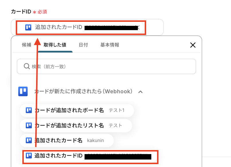 入力欄をクリックするとアウトプットを選択できるので、「取得した値」の「カードが新たに作成されたら(Webhook)」内にある、「カードID」を選択してください。