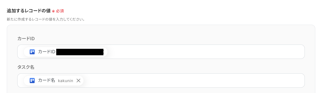 たとえば、「カードID」には、「取得した値」の「カードの情報を取得」内にある、「カードID」を設定するなど、それぞれ項目に合うアウトプットを設定してみてくださいね!