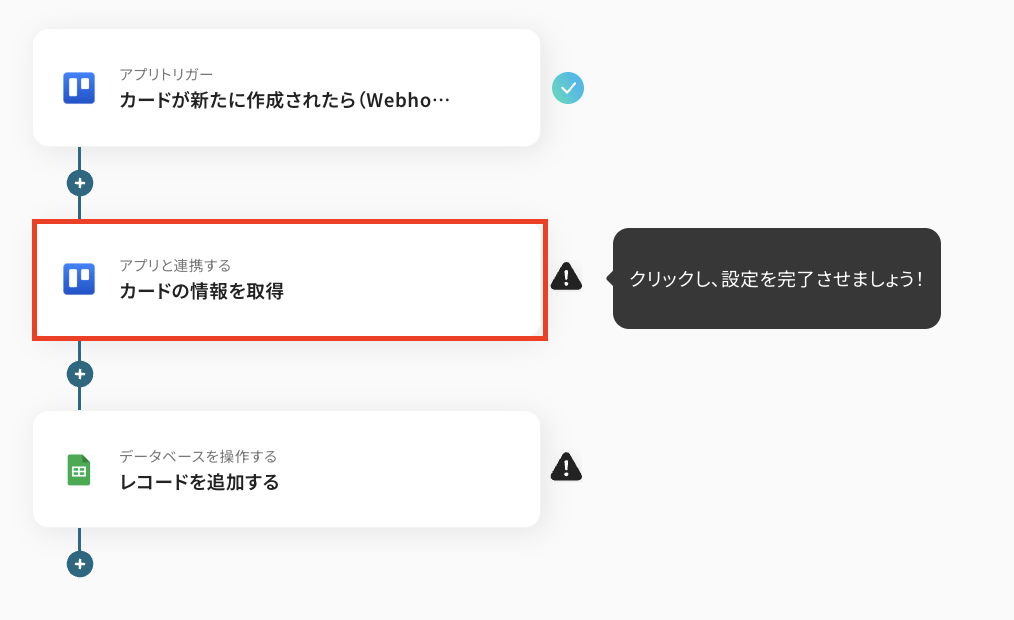 コピーしたテンプレートの、「カードが新たに作成されたら(Webhook)」をクリックしてください。