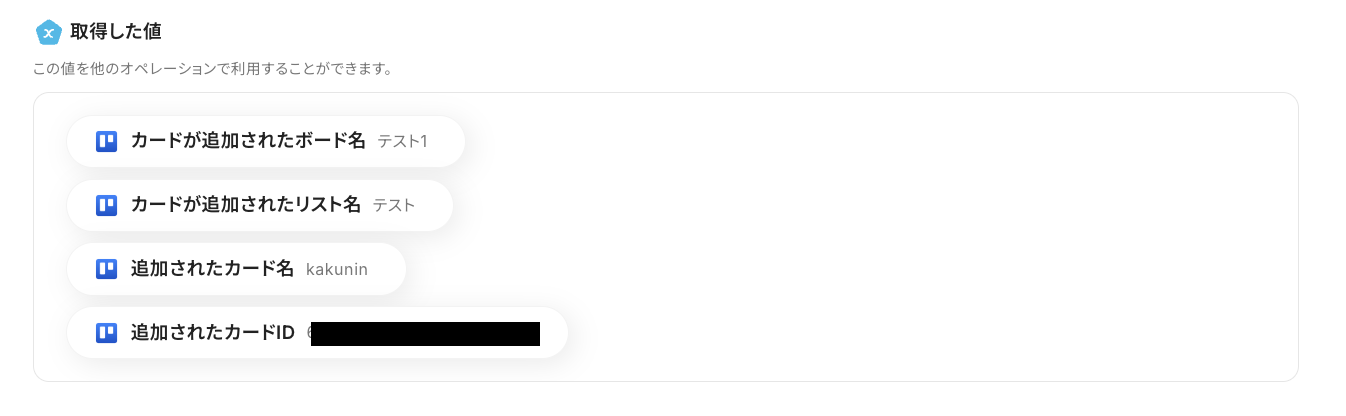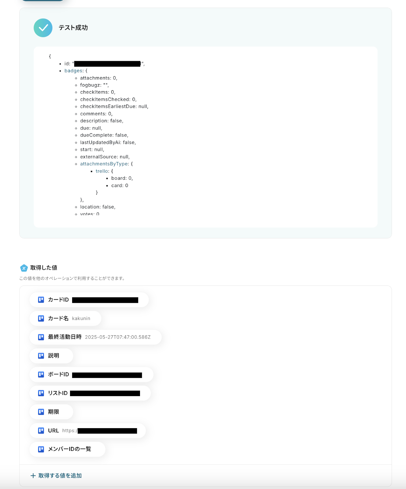 テストが成功すると「取得した値」に、先ほど作成したカードの情報がアウトプットとして抽出されるので、内容を確認しましょう。