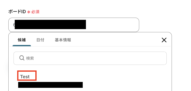 「ボードID」は、入力欄をクリックして表示される候補からフローで使用するボードを選択します。候補は連携しているアカウントに紐づいて表示されていますよ!