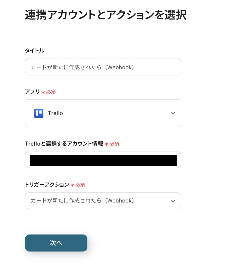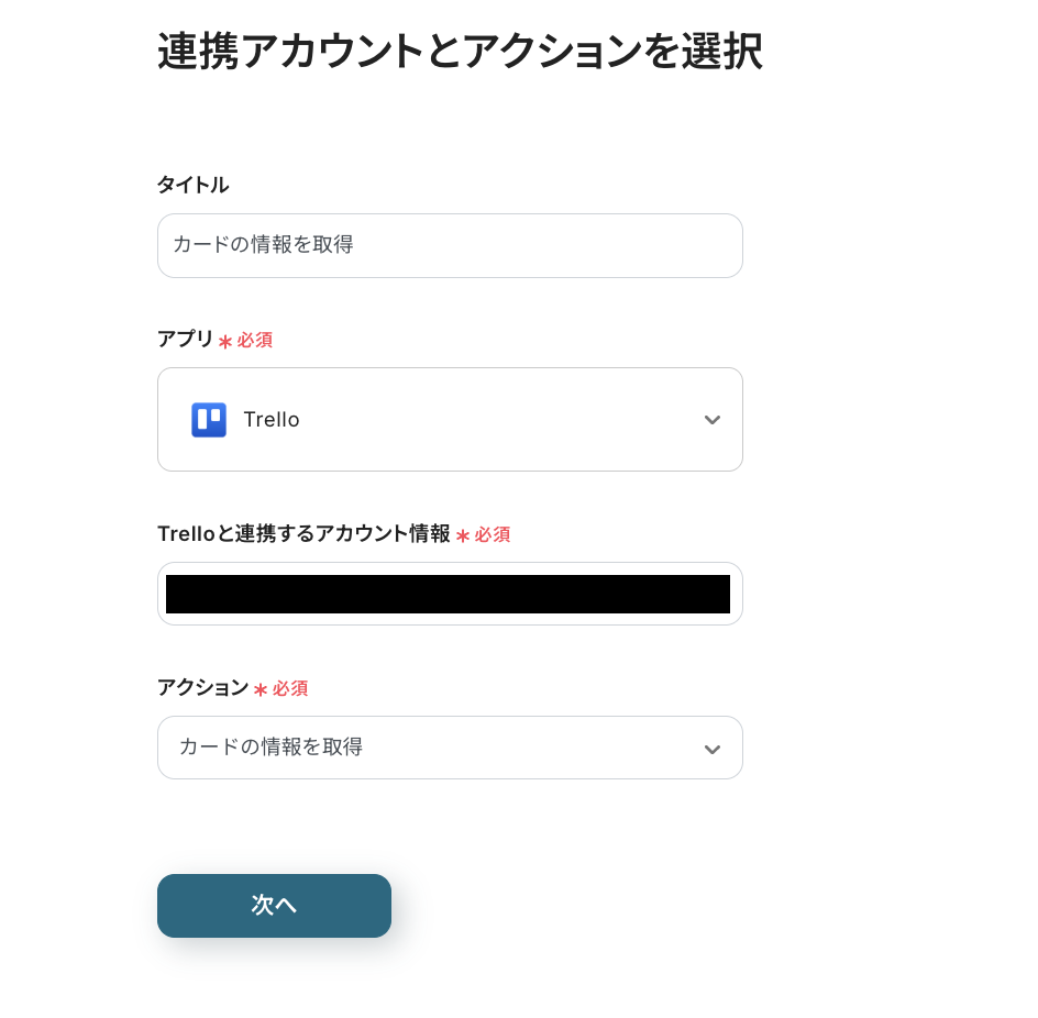 先ほどと同じようにタイトルを必要に応じて変更し、連携するアカウント情報はステップ3と同じものであることを確認しましょう。アクションは変更せず「カードの情報を取得」のままにして、「次へ」をクリックしてください。
