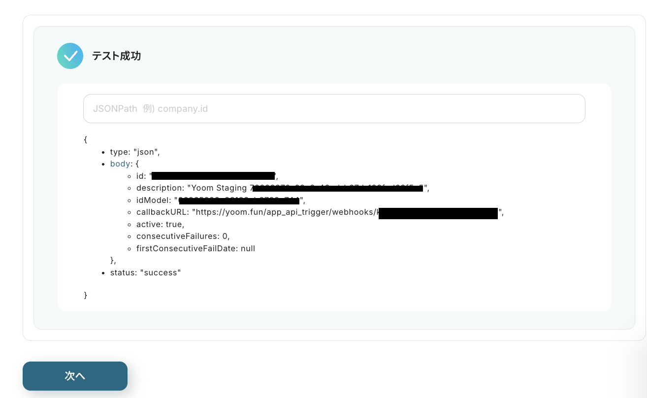 テストが成功すると、「取得した値」にステップ3で作成したカード情報の詳細が抽出されるので、内容を確認しましょう。