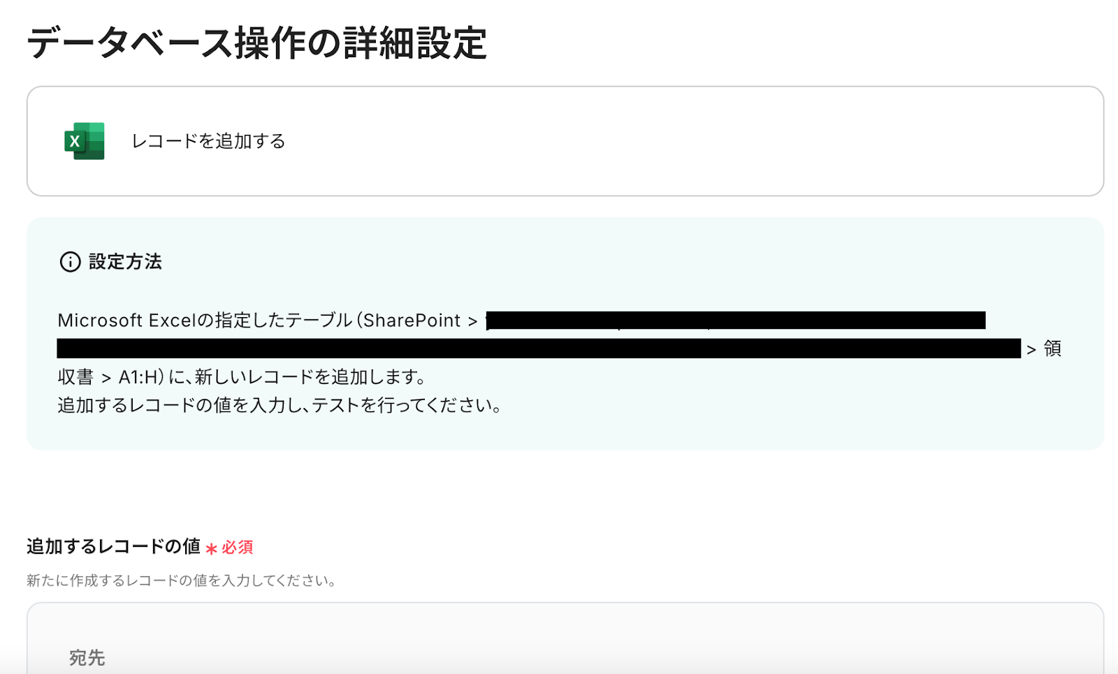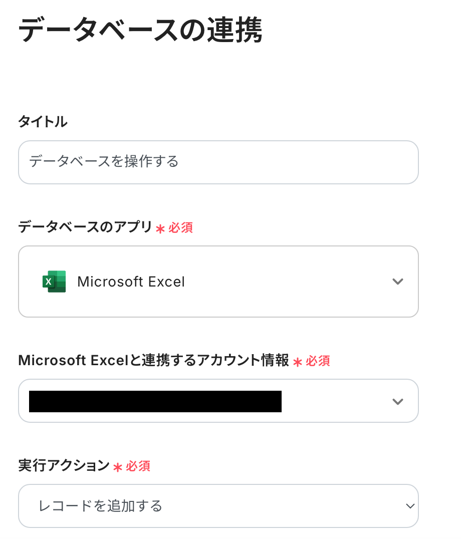 ※「追加するレコードの値」の各項目は、先ほどのデータベース連携時に指定したシートに紐づいて表示されています。項目を編集したい場合は、シートを編集してくださいね!